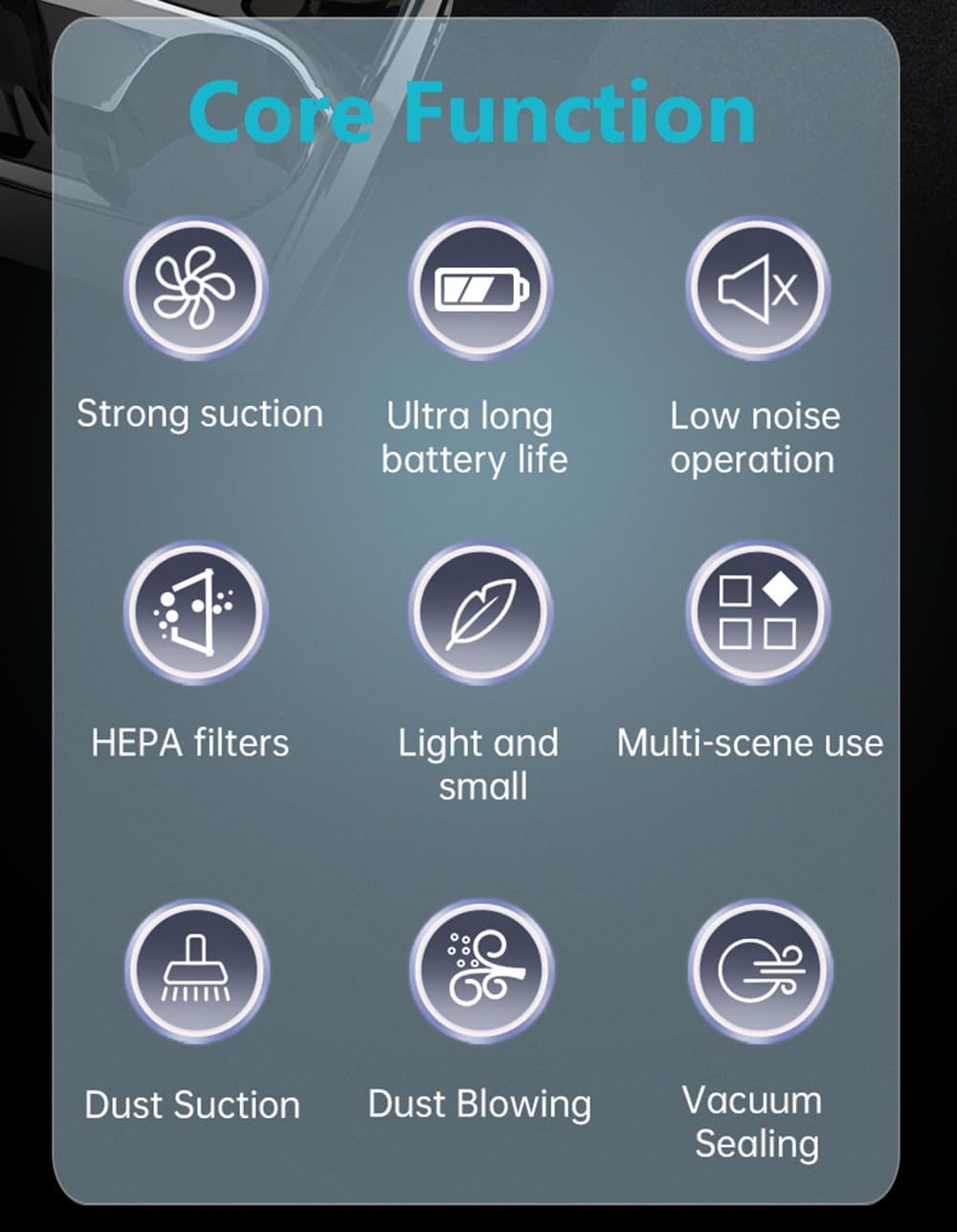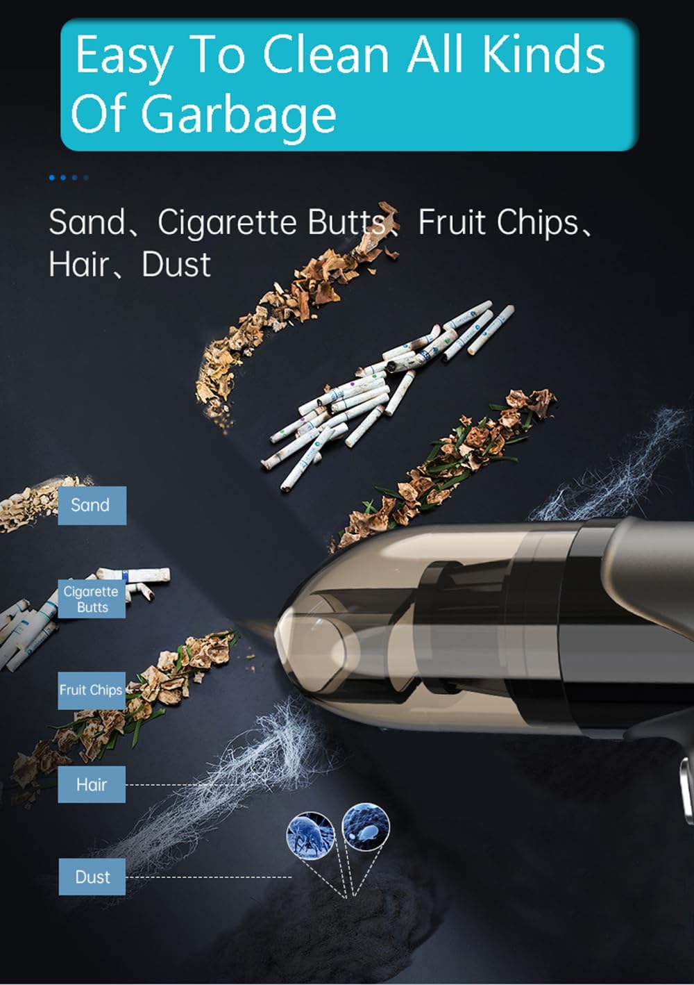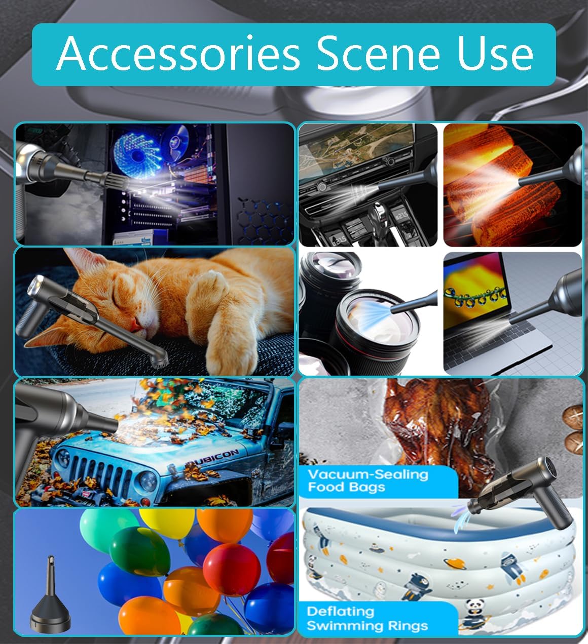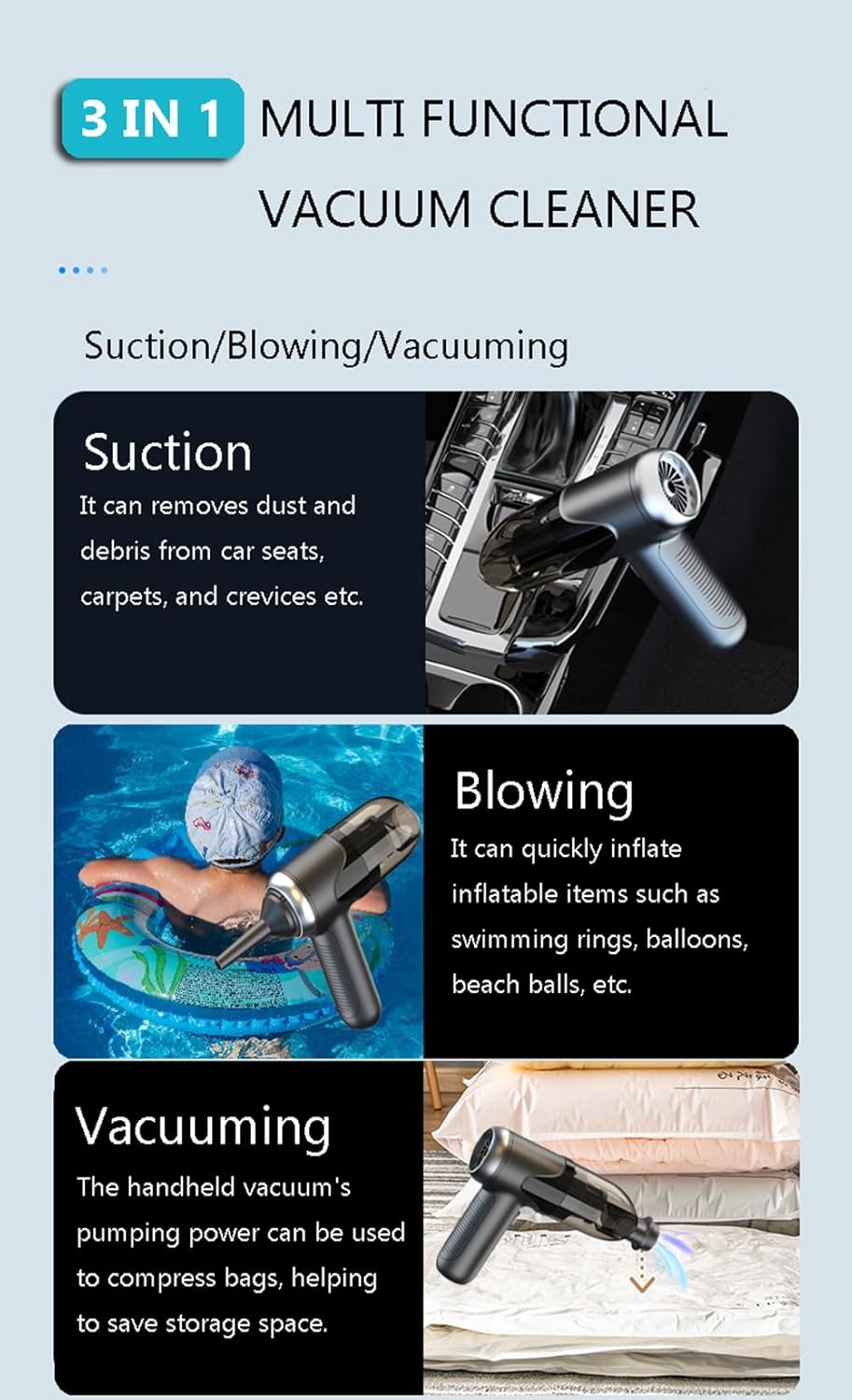 - π¨[3-IN-1 VACUUM CLEANER] This handheld vacuum cordless comes with 7 detachable accessories for blowing, vacuuming, and inflating, meeting all your daily cleaning needs. Its powerful suction effortlessly removes dust and debris from car seats, carpets, and crevices. The other end functions as a blower, easily clearing dust from keyboards, camera lenses, and windows, it can also inflate balloons and swim rings.