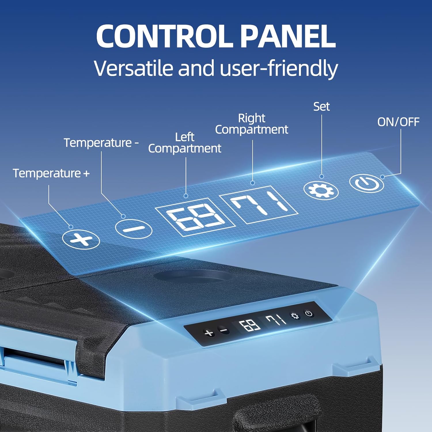 25L Car Refrigerator Freezer, 27QT Dual Zone Portable Compressor Cooler with Reversible Door, 100–240V AC / 12V / 24V DC Powered, Touchscreen Control, LED Light, -4℉ to 68℉, Ice Blue