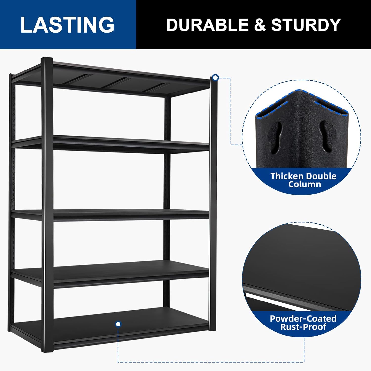 - 5-Tier Storage Shelves – Each shelf supports up to 700 pounds (evenly distributed), with a total maximum load capacity of 3500 pounds, making it perfect for garages, basements, workshops, and more.