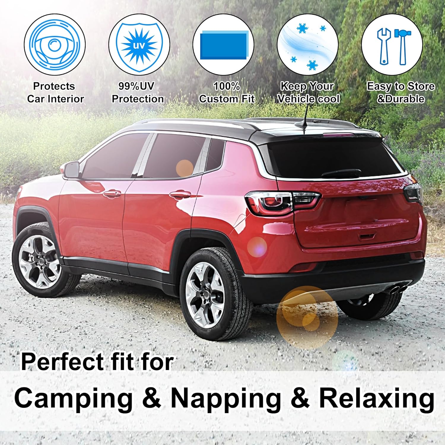 - Customized Design:The sun shade custom fit for Jeep Compass 2017-2024.Our window shade is according to the car size design,perfectly fit your car and does not need to trim.windshield sun shade solve the problem of light leakage and incompatibility of the old umbrellas.The sunshade designed for Jeep Compass.
