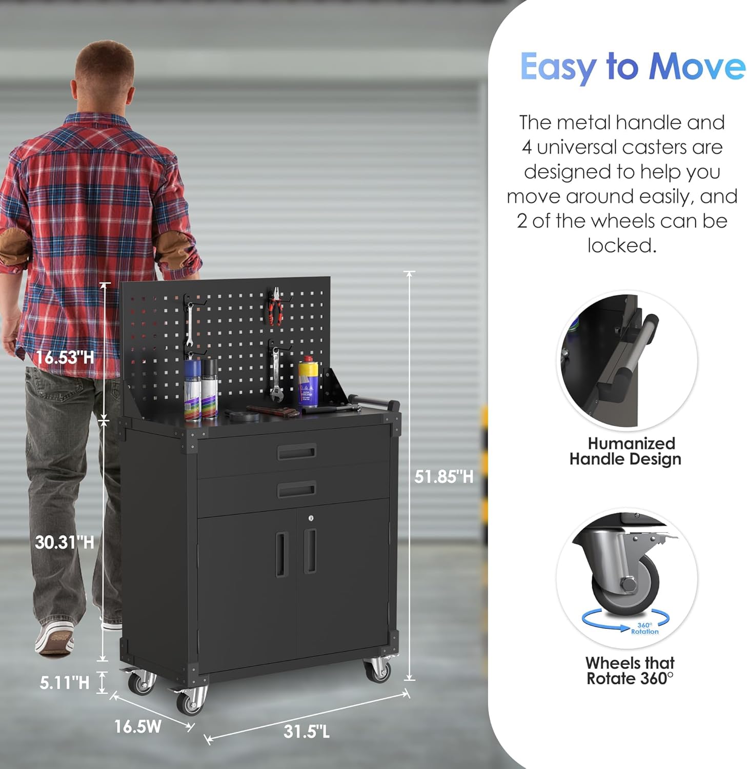 - Versatile Hole Board: Includes a 31.5" x 16.53" hole board on the top for hanging tools and accessories with the four included hooks.