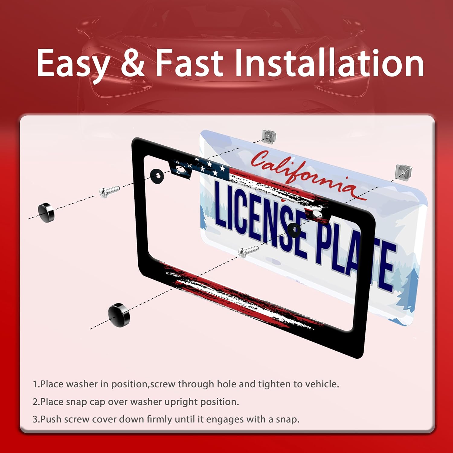 - 【Products And Accessories】:license plate holder, including (screws, screw covers, washers) above the slot, use the included accessories to install the license plate holder, easy to operate, quick installation, no special tools required.