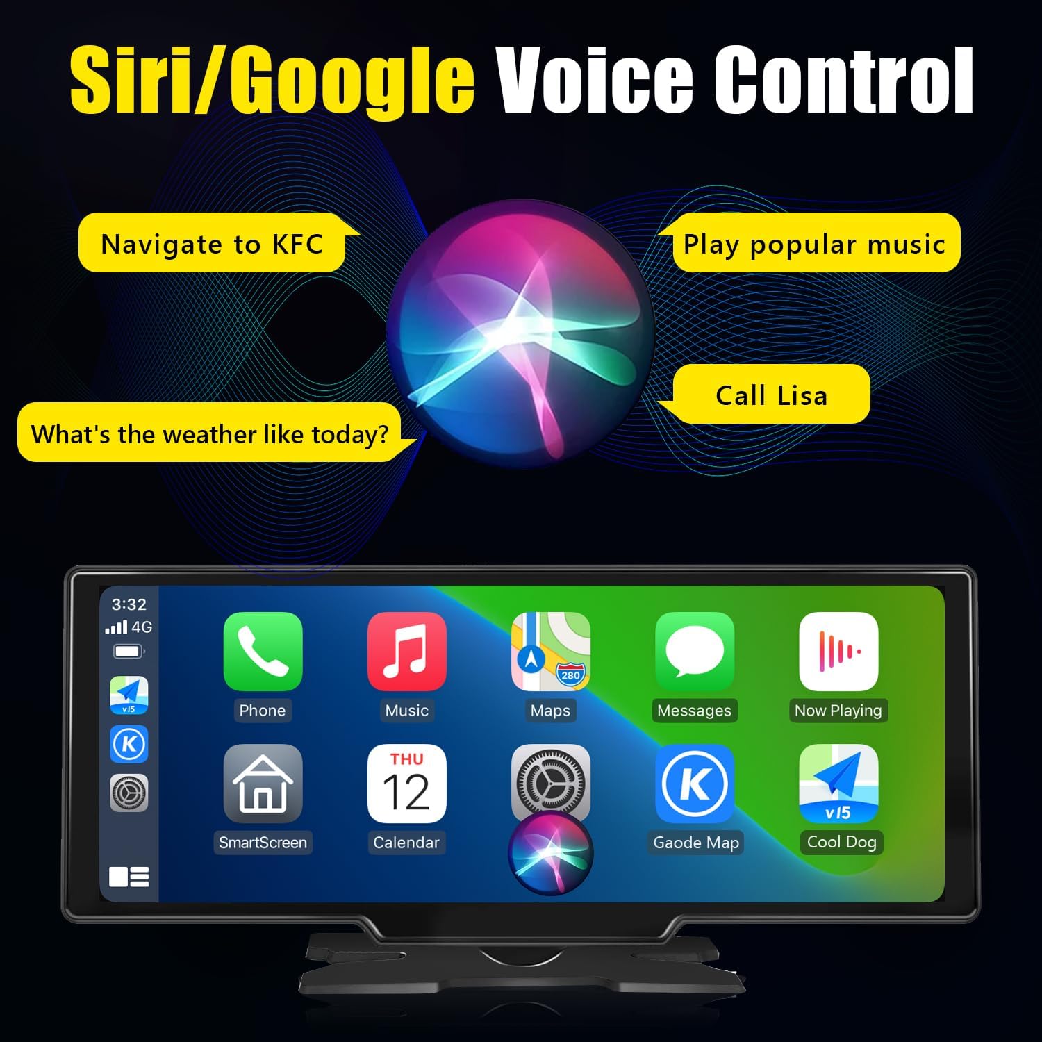 - ăWireless Carplay & Android AutoăThis portable car stereo screen is compatible with Apple Carplay and Android Auto functions.You can simply get into your car and your Smartphone will automatically connect to the car carplay screen; With CarPlay display, you can access your smartphone's apps, maps, music, videos, and other features, as well as use Siri or Google Assistant voice to control the CarPlay screen.
