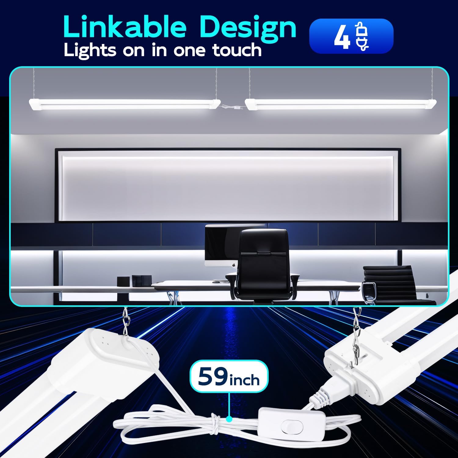 hykolity 4 Pack Linkable LED Shop Light, 4FT 44W [300W Equivalent], 4600lm, 5000K Daylight, Plug-in Utility Light Fixture, Hanging or Surface Mount, White - Energy Efficient Lighting Solution