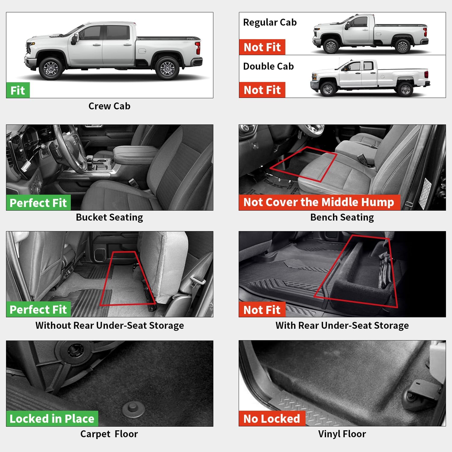 - : Vehicle Service Type Fit Without Under-Seat Storage Box; Not Fit Regular Cab/Double Cab; Not Fit Bench Seat; Not Fit Vinyl Floor Fit Without Under-Seat Storage Box; Not Fit Regular Cab/Double Cab; Not Fit Bench Seat; Not Fit Vinyl Floor See more