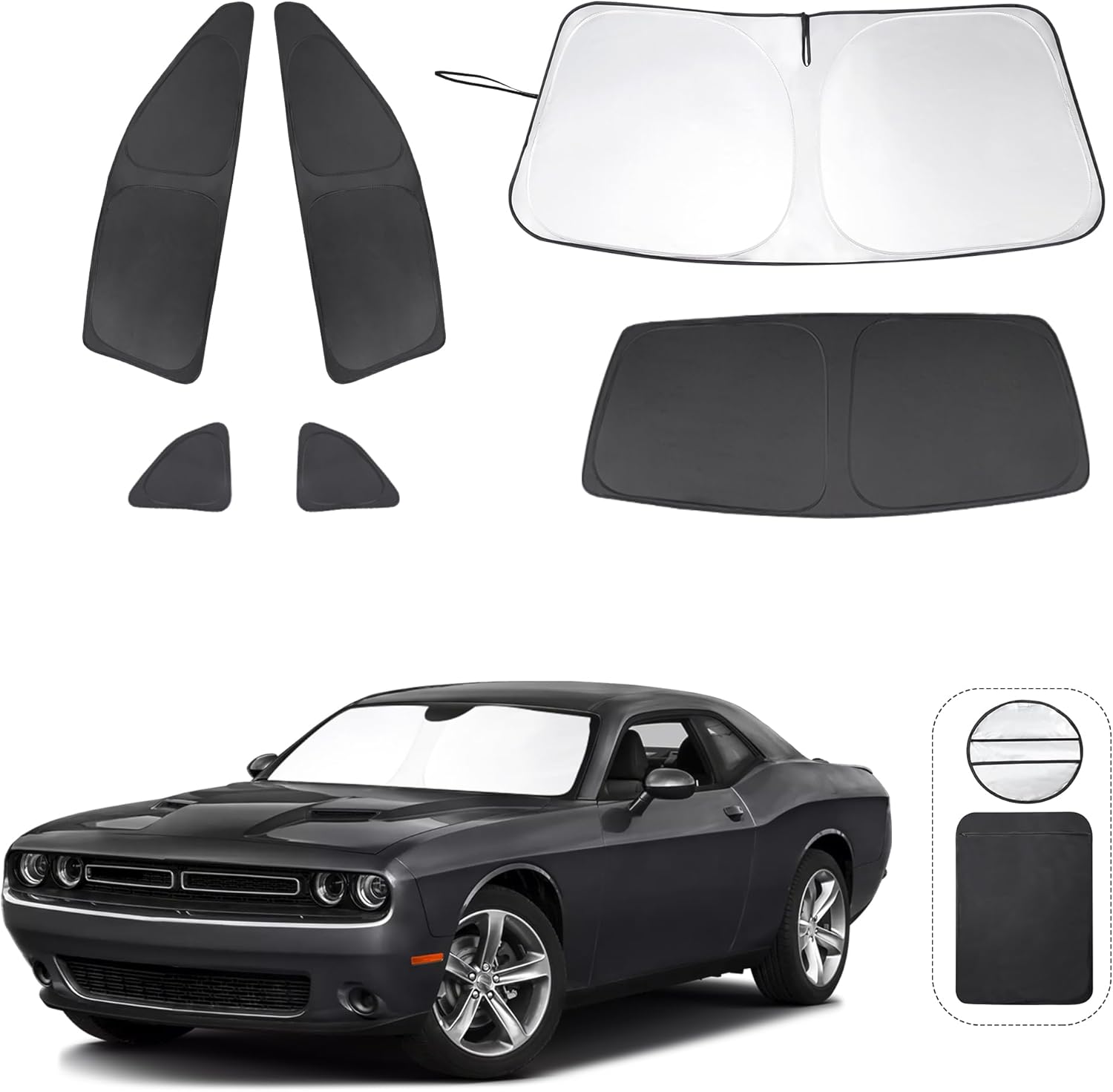 - Customized Design:The sun shade custom fit for Dodge Challenger 2015-2023 Coupe,SRT Hellcat,Redeye,GT,RT,TA Coupe,Widebody,SXT,RT Scat Pack.Our window shade is according to the car size design,perfectly fit your car and does not need to trim.windshield sun shade solve the problem of light leakage and incompatibility of the old umbrellas.The sunshade designed for Dodge Challenger 2015-2023 Coupe,SRT Hellcat,Redeye,GT,RT,TA Coupe,Widebody,SXT,RT Scat Pack.