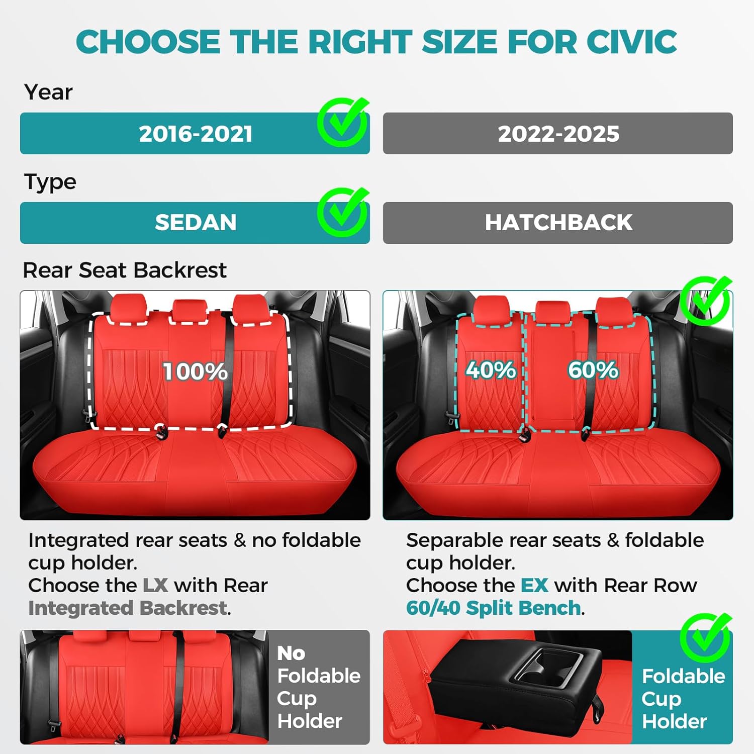 - Tailored for Civic - Designed exclusively for civic, ensuring a perfect fit like a glove.Say goodbye to ill-fitting, sliding universal covers with limited coverage.Please note that these size only fit for the 2016-2021 Civic Sedan EX-L, EX-T, EX, Touring, LX-P, Sport.Ensure that your back row has three seats that are split 40/60 and equipped with foldable cup holder armrests, and that your Civic is a sedan model.