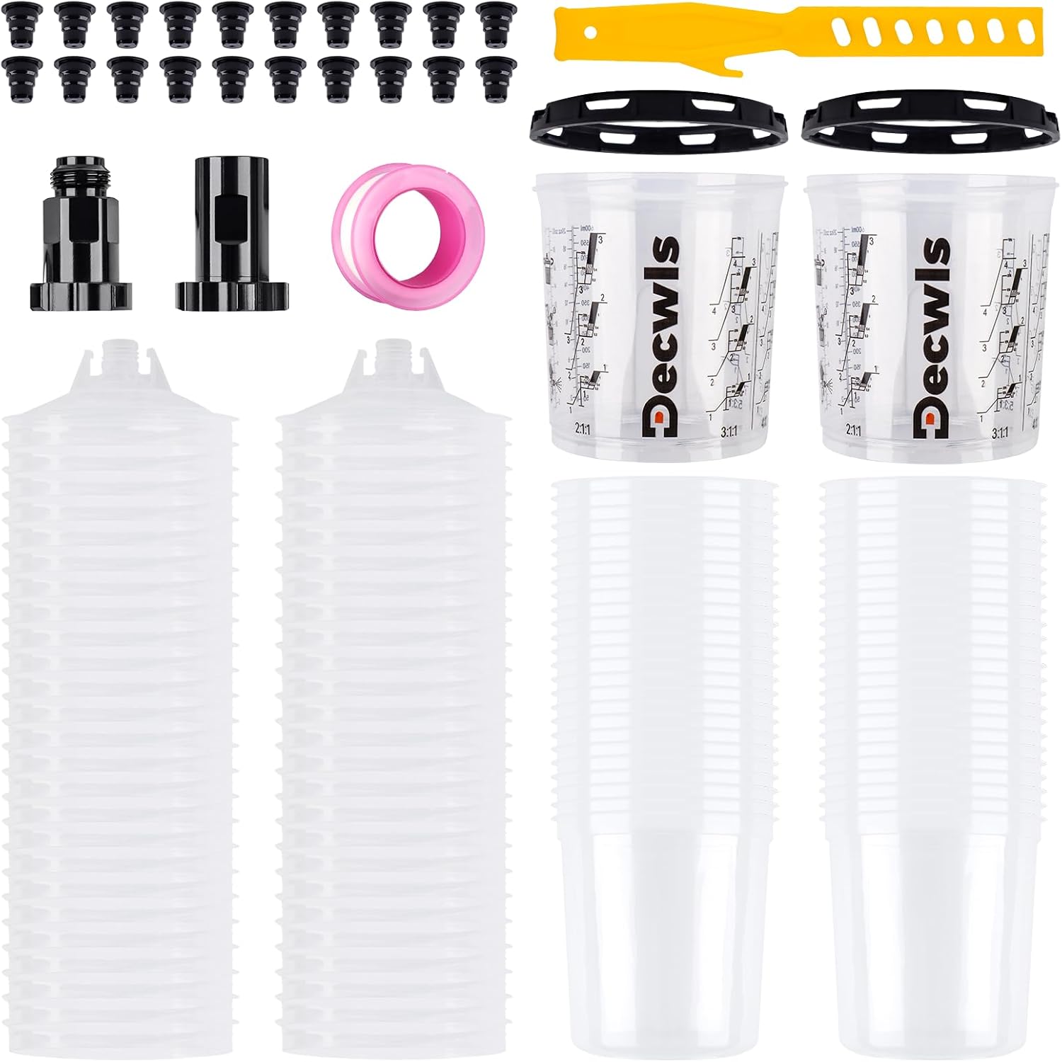 - Mix, Spray, and Store: Decwls spray gun cups streamlines mixing, spraying, refilling and storing. Easy to Mix - the paint cup has measuring lines that allow you to mix paint directly with the liner. No Cleaning - just replace the spare liner. Easy to Store - seal unused paint with the cup plug for future use. This disposable paint cups system saves paint, cleaning solvents, labor costs and time costs.