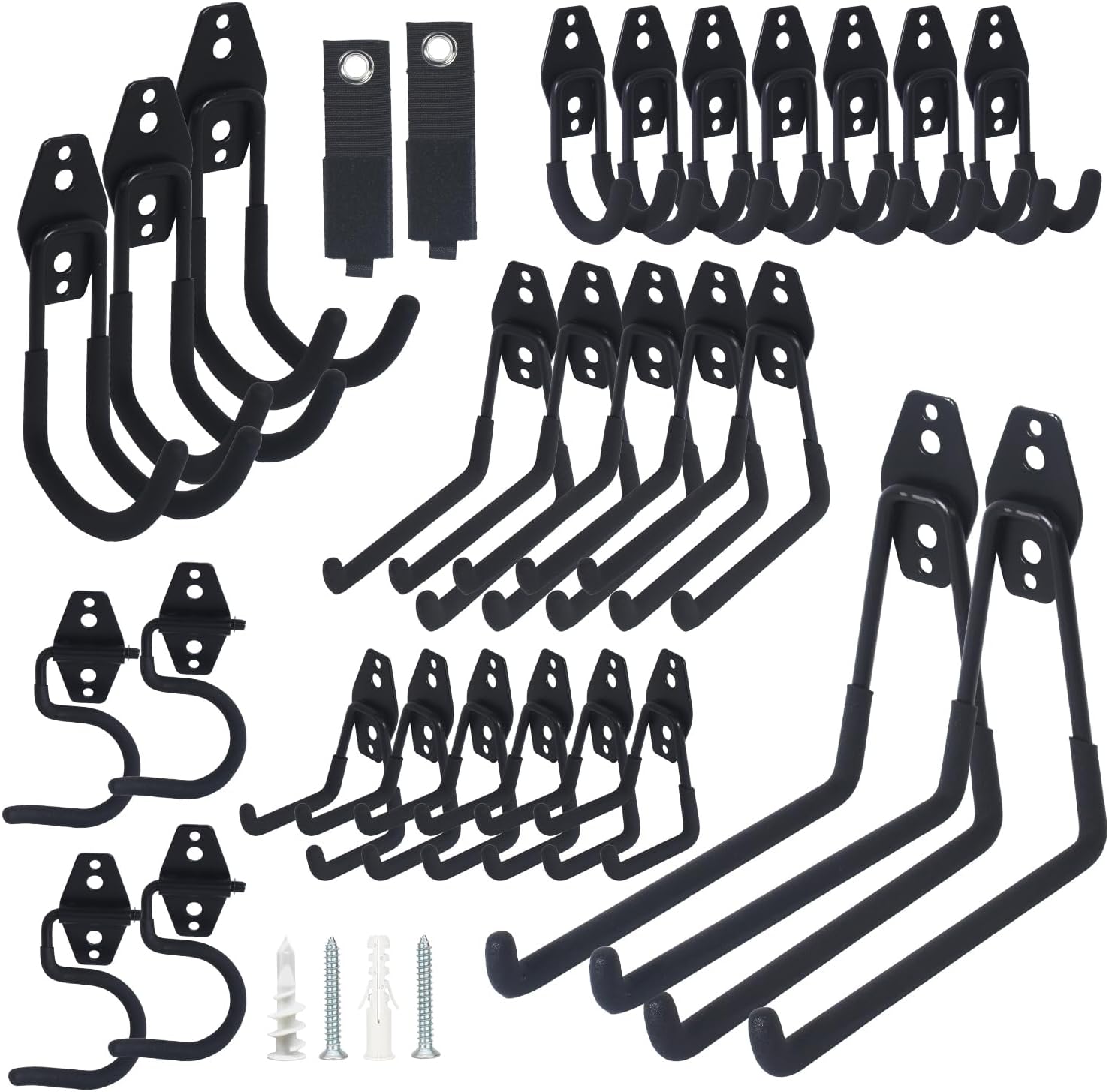 - Easy to Install - Comes with a total of 56 sets of screws and anchors for drywall, wood, or concrete. With only a screwdriver, the garage heavy-duty storage hooks can be easily installed on plaster walls and drywall, or with a small drill for wooden, concrete, and brick walls.