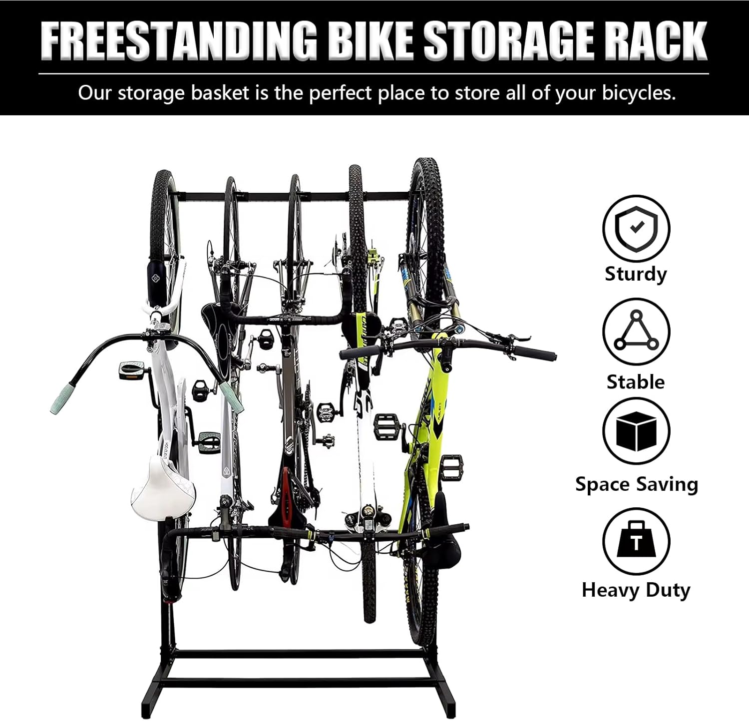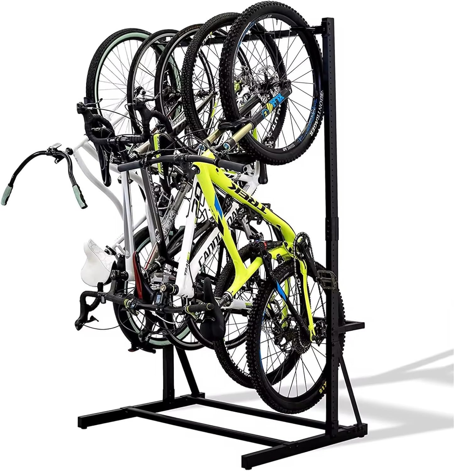 - 🚲【FREE-STANDING AND MULTI-BIKES RACK】 Designed to hold up to 5 bikes upright, just stagger your 5 bikes head to tail in the rack. perfect for storing road bikes, mountain bikes, hybrid bikes, adult bikes, kid bikes, etc.