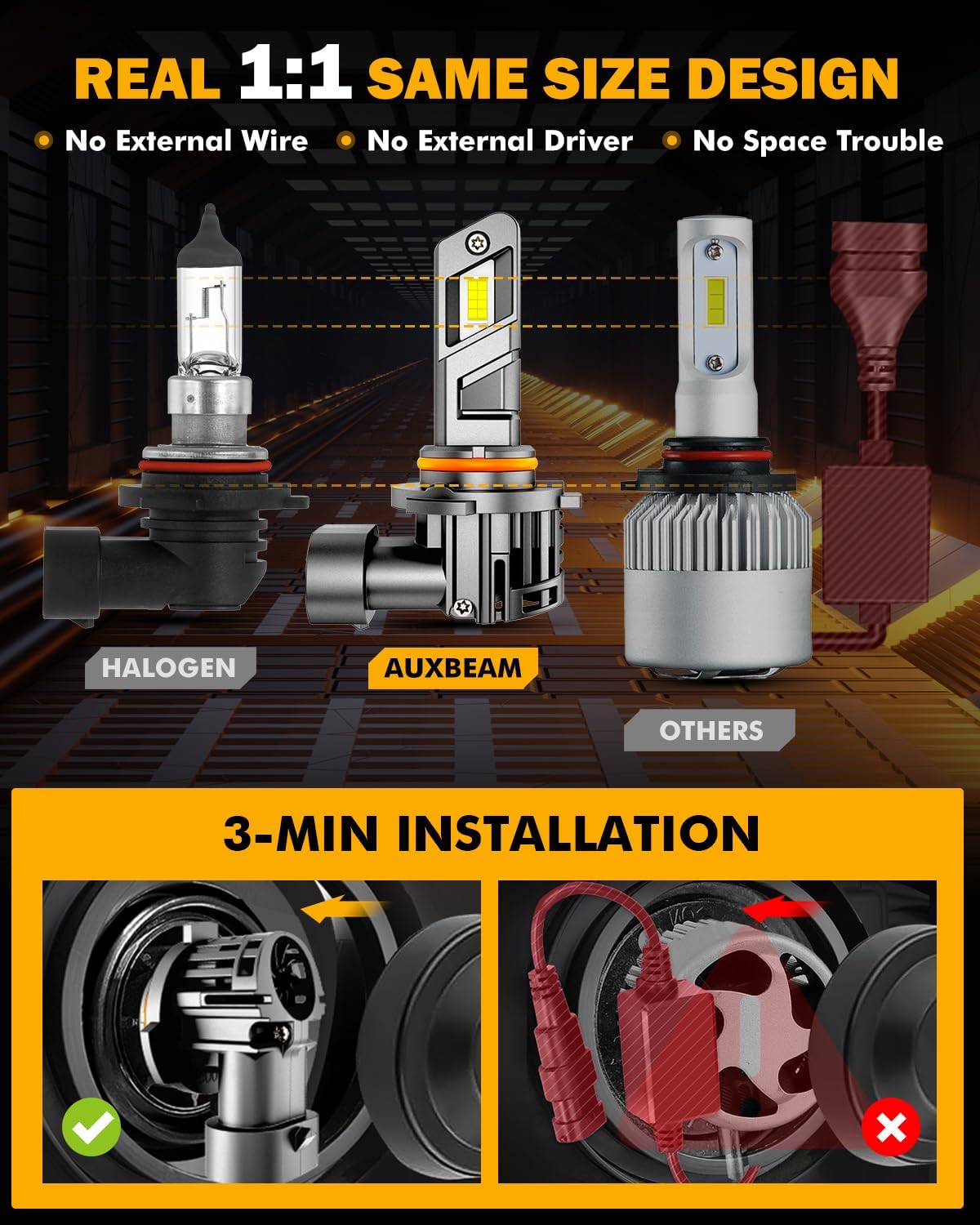 - All-in-one Metal Design: No bulky external drivers & wiring harnesses, No plastic adapter, No plastic plug. Metal Shell from head to toe. Super solid and heavy duty. The 9005 lights fuse stable brightness with good affordability.