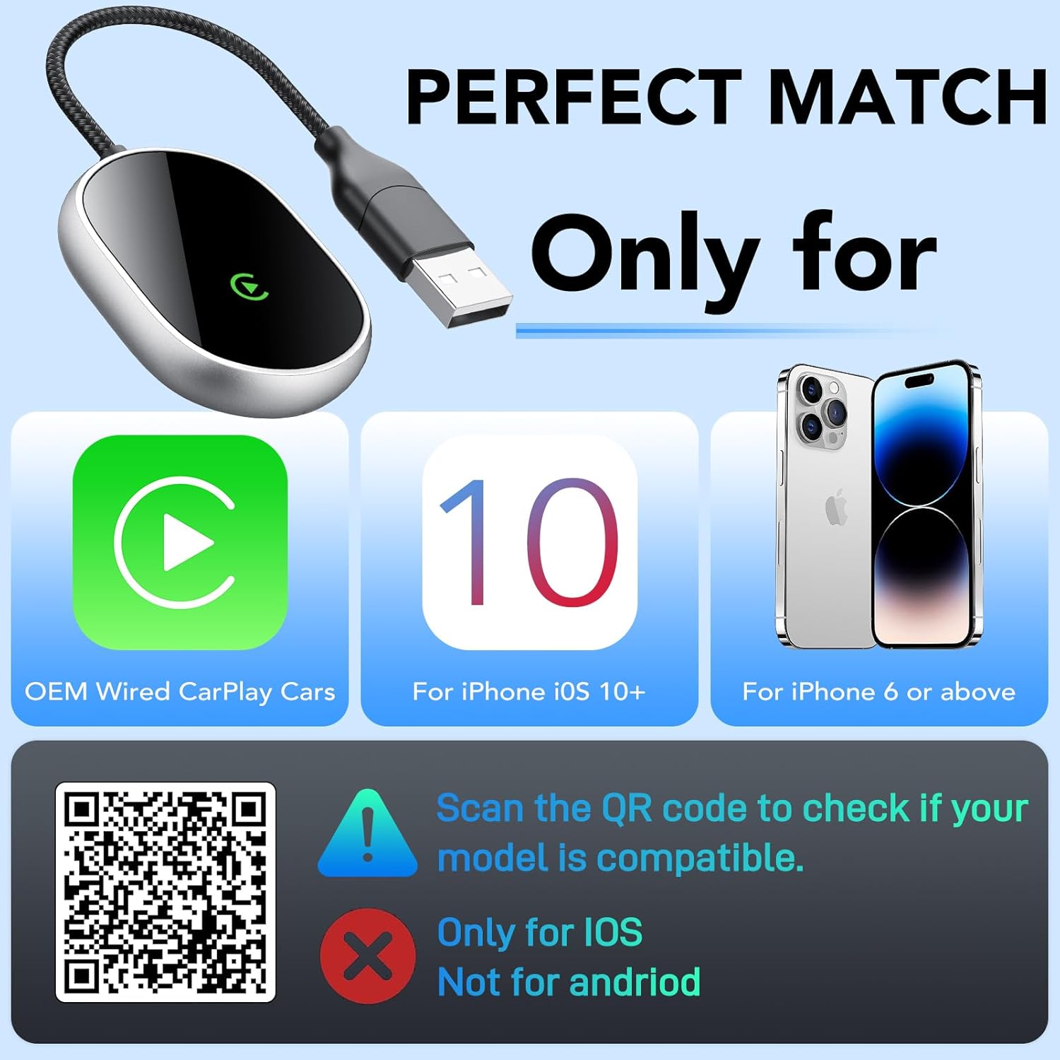 Wireless CarPlay Adapter for Apple iPhone, 2025 Upgraded Converts Wired to Wireless Car Play Adapter, Auto Connect, Mini Size, Compatible with Cars from 2016 & iOS 10+