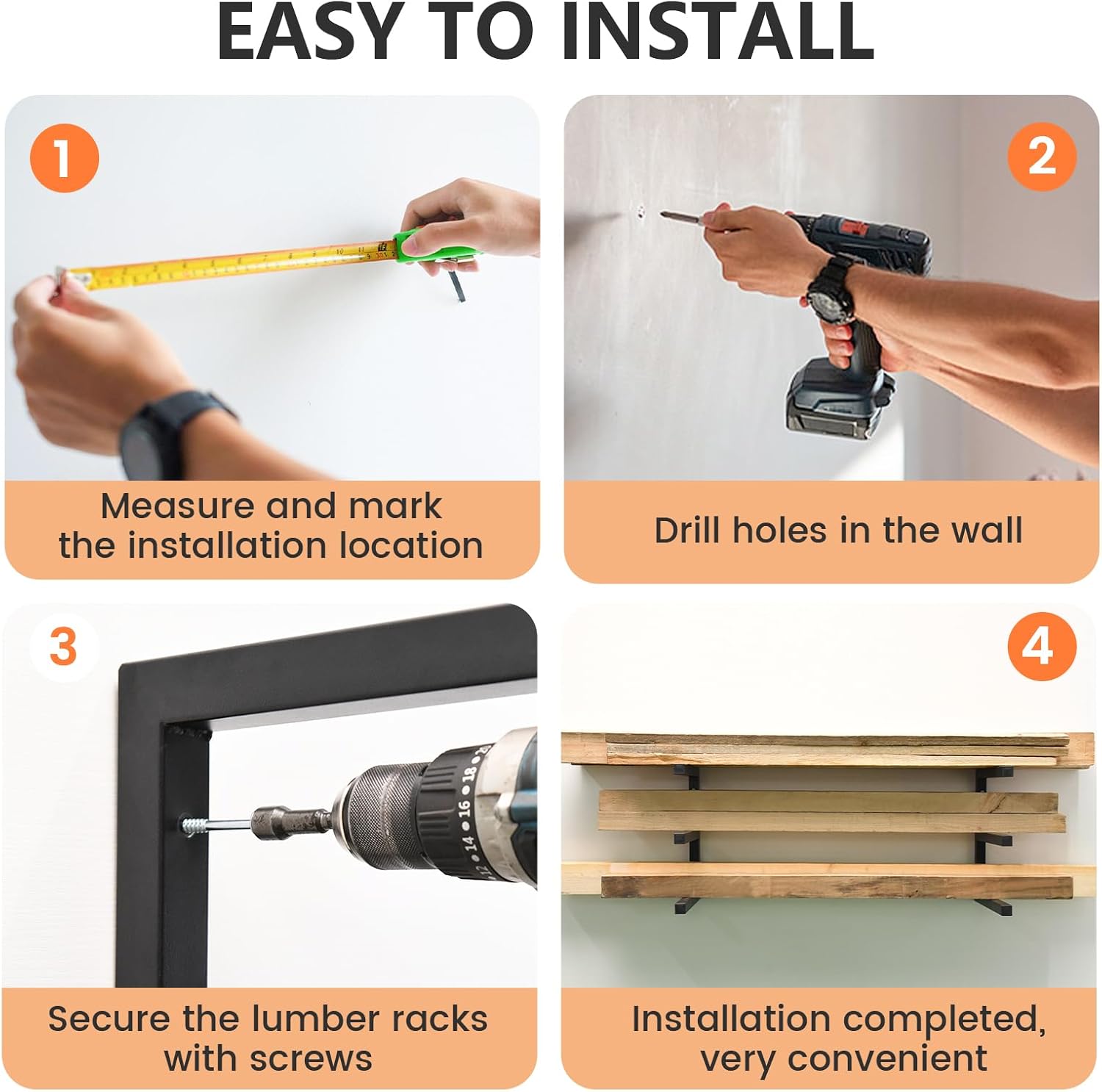 - [Heavy Duty Lumber Storage Rack]: Our wood storage shelves can be mounted on a variety of wall materials, such as concrete walls, wooden walls, red brick walls, etc. Two racks in a group, each shelf can hold 220 pounds, a total of 1,320 pounds, the load capacity is excellent, can meet your daily needs.