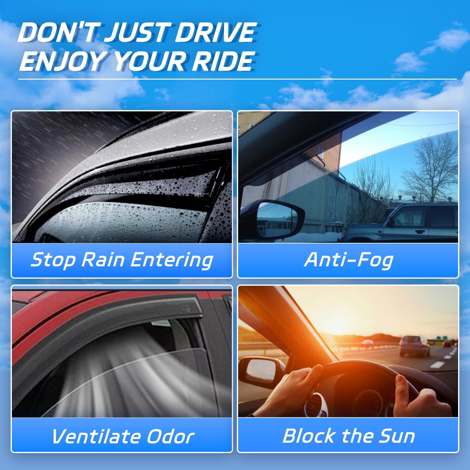 - ăImprove Driving Experienceă Allows fresh air to circulate through open windows while keeping the rain out or reduces heat. Reduce mirror and window fogging; reduce sun glare through side window. Dark Smoke translucent color will not obstruct the driver's view while driving
