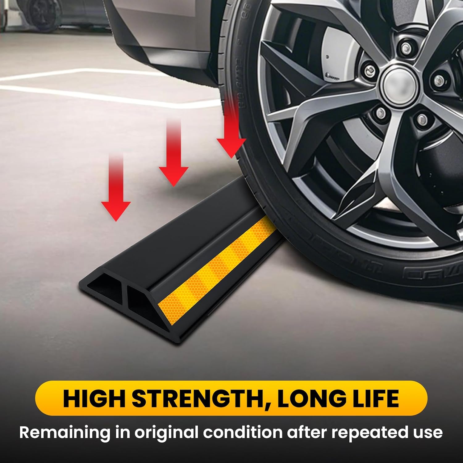 - ECO-FRIENDLY MATERIAL: Our parking aid for garage vehicle is made of environmental protection material with no strong odor like other rubber products. The wheel stops are with conspicuity yellow safety stripes to improve the visibility