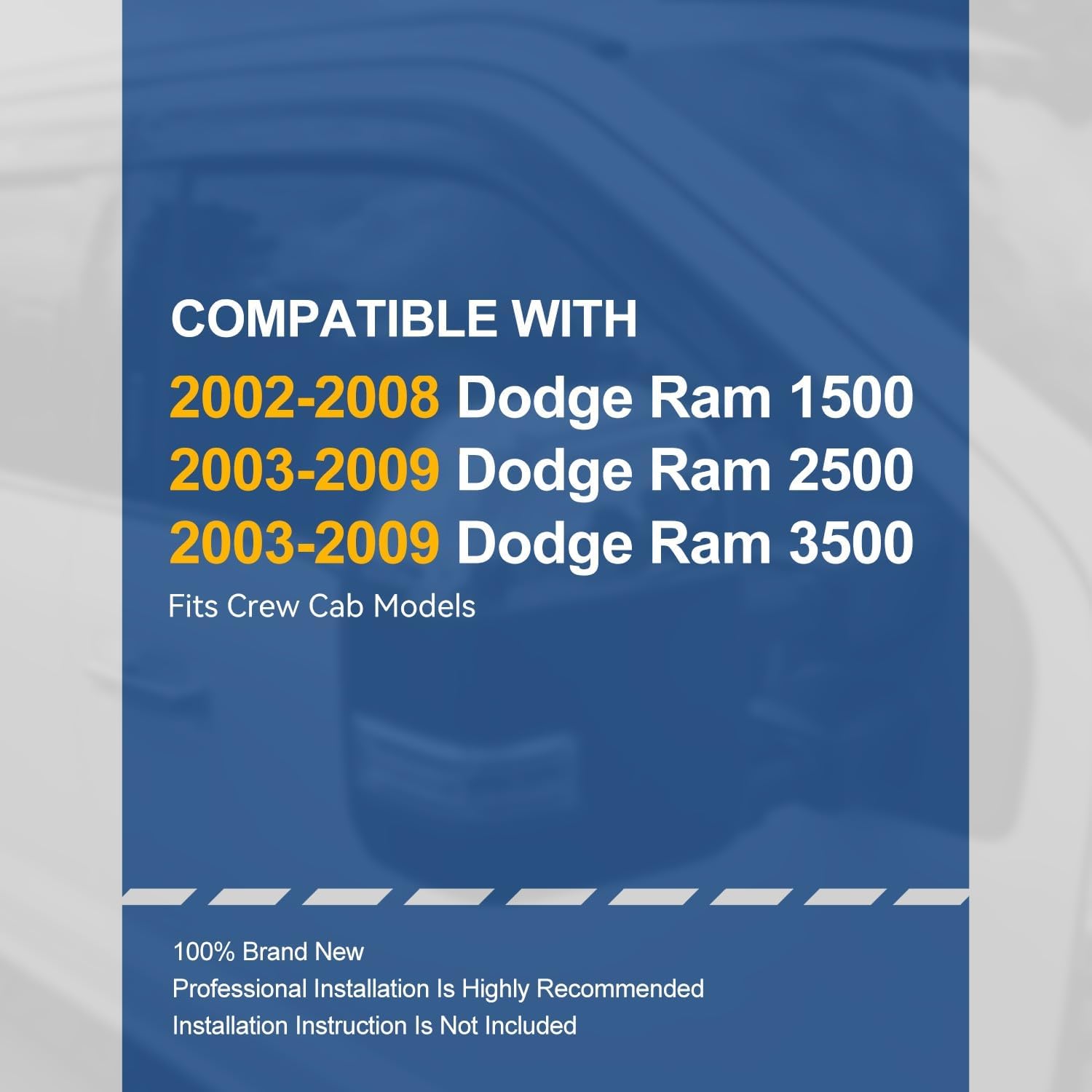- Vehicle Compatibility - Window Visors Compatible with 2002-2008 Dodge Ram 1500 , 2003-2009 Dodge Ram 2500 , 2003-2009 Dodge Ram 3500, Fits Crew Cab Models
