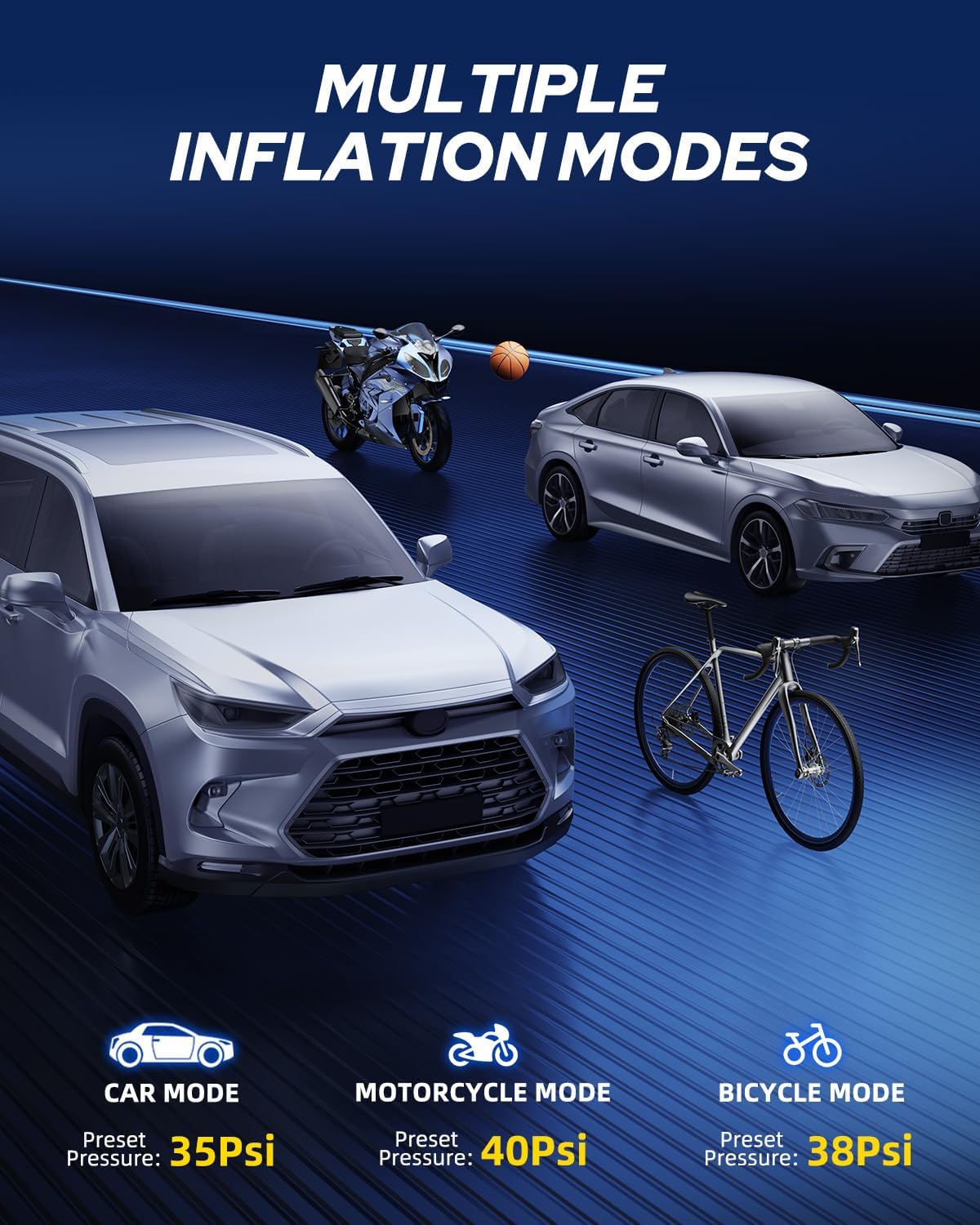 - One-Click Operation: Automatically detect real-time tire pressure. It offers 4 preset inflation modes (cars, motorcycles, bicycles, and balls) and 3 preset units (PSI, KPA, BAR). With just one click, you can select the desired inflation mode, Once the preset pressure has been reached the smart tire inflator will automatically shut off. Safe and reliable use for users unfamiliar with air pressure settings