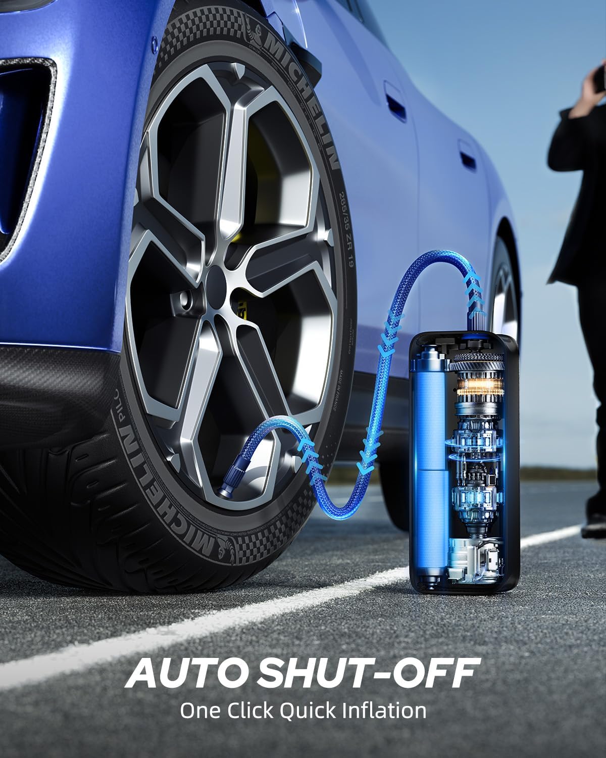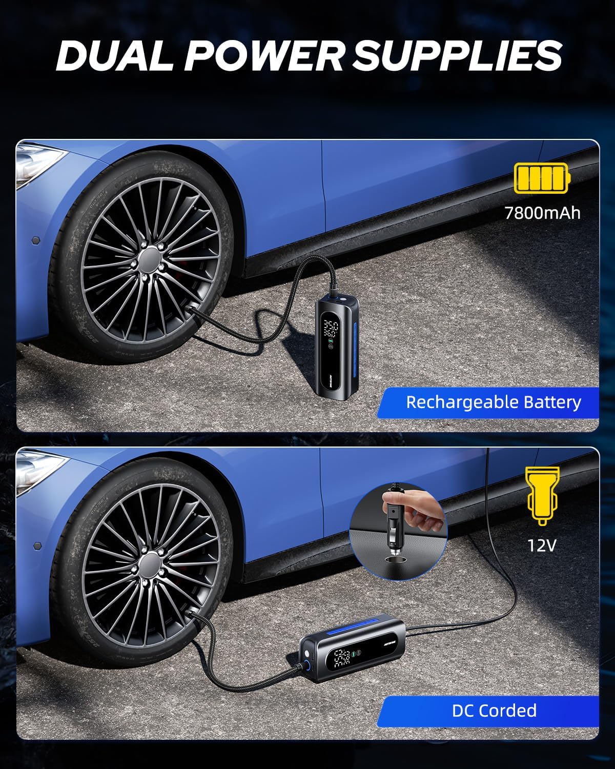 - Convenience to Inflate from Any Angle: Portable tire inflator built in 7800mAh powerful rechargeable battery with an 19.7 inch upgraded anti-scalding and high-pressure hose for cordless convenience. Whatβs more, 12V car power adapter is also available(11.5 FT long wire to cover whole car), providing uninterrupted inflation at any time