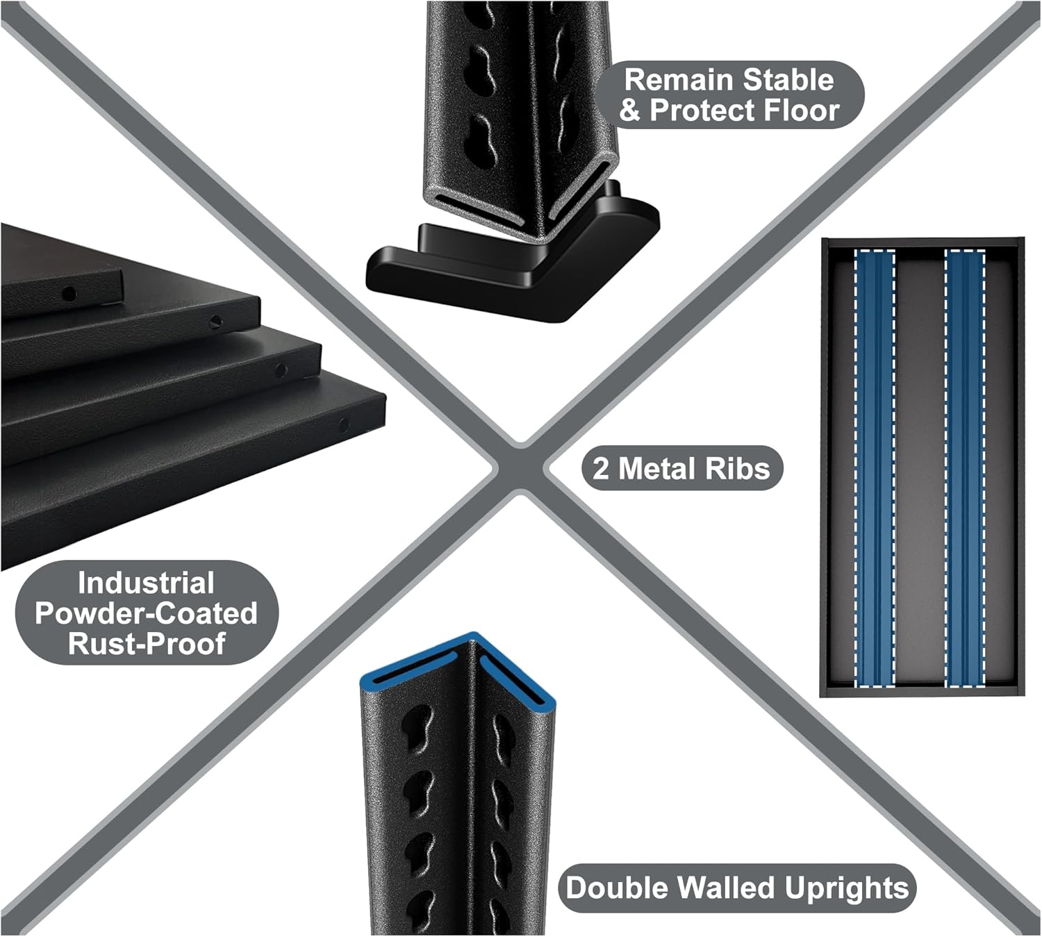 - 【Great Strength and Durability】The shelving unit is definitely an upgrade from the traditional wire shelves of the past.All metal shelves with bracing ribs and 1.2mm thickened metal uprights complete the unit with a total of 1650 lbs bearing capacity.No need to worry about overloading the shelves.