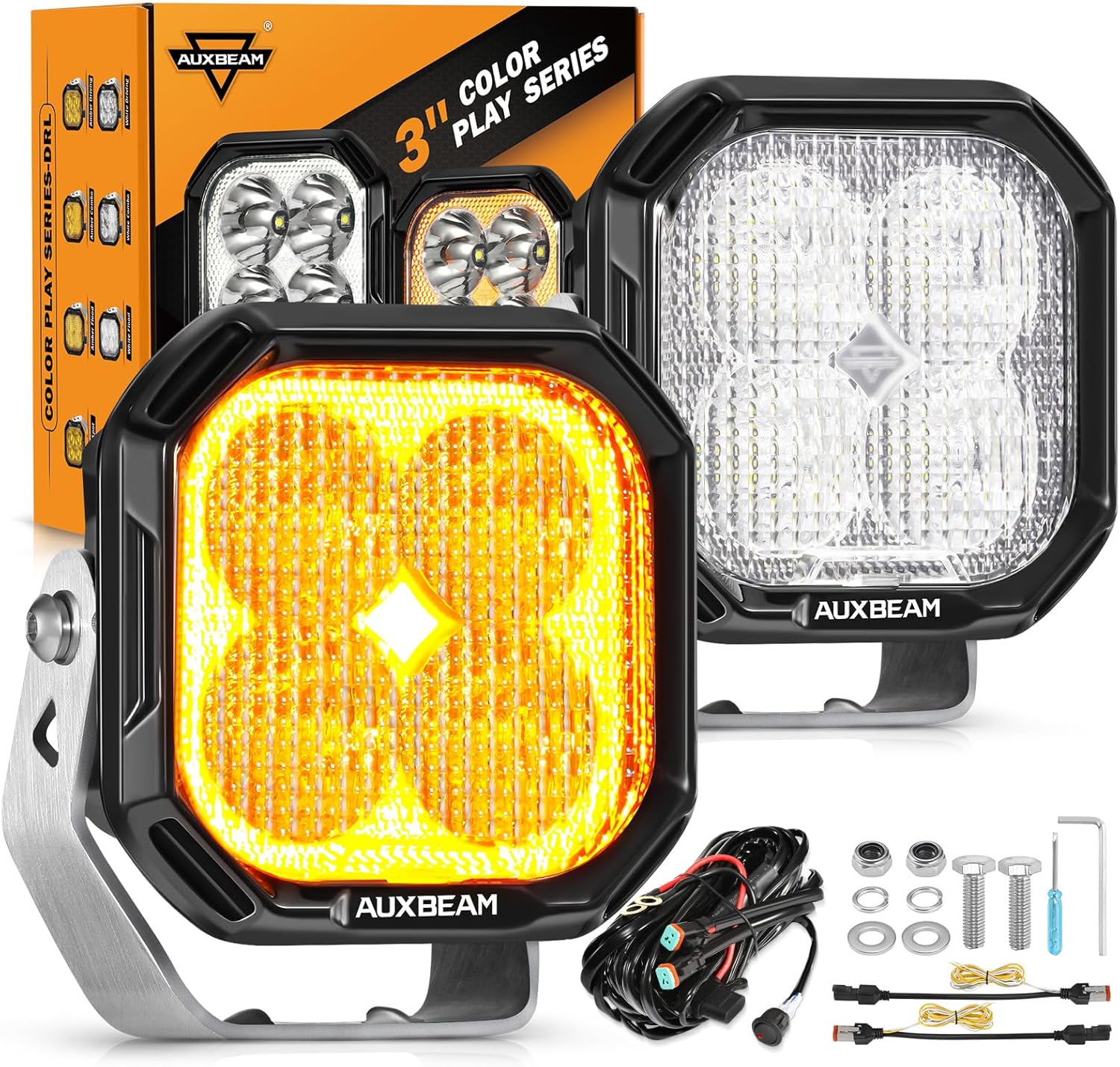 - 【ALL-IN-ONE LIGHTING SOLUTION】AUXBEAM Color Play Series 3-in-1 design combines a powerful main light, daytime running light (DRL), and turn signal in one compact unit. Plus, with interchangeable lenses, you can switch between crisp white for clarity and amber for fog or dust , Your lights are fully customizable