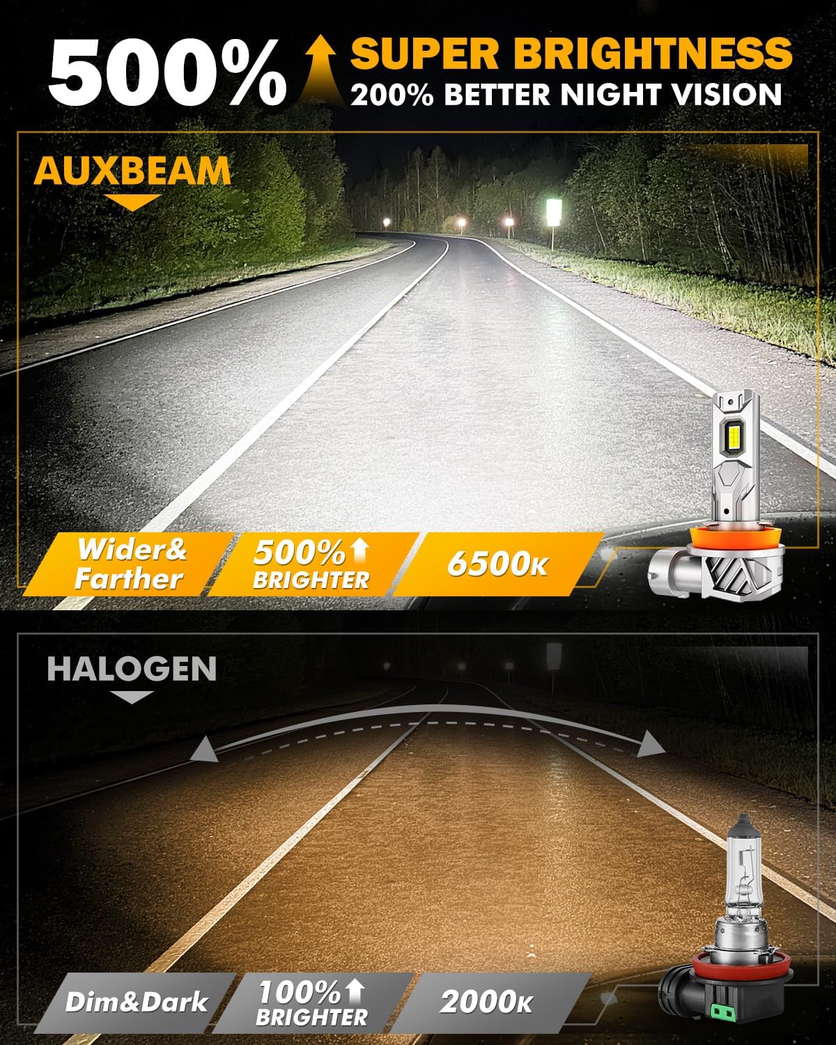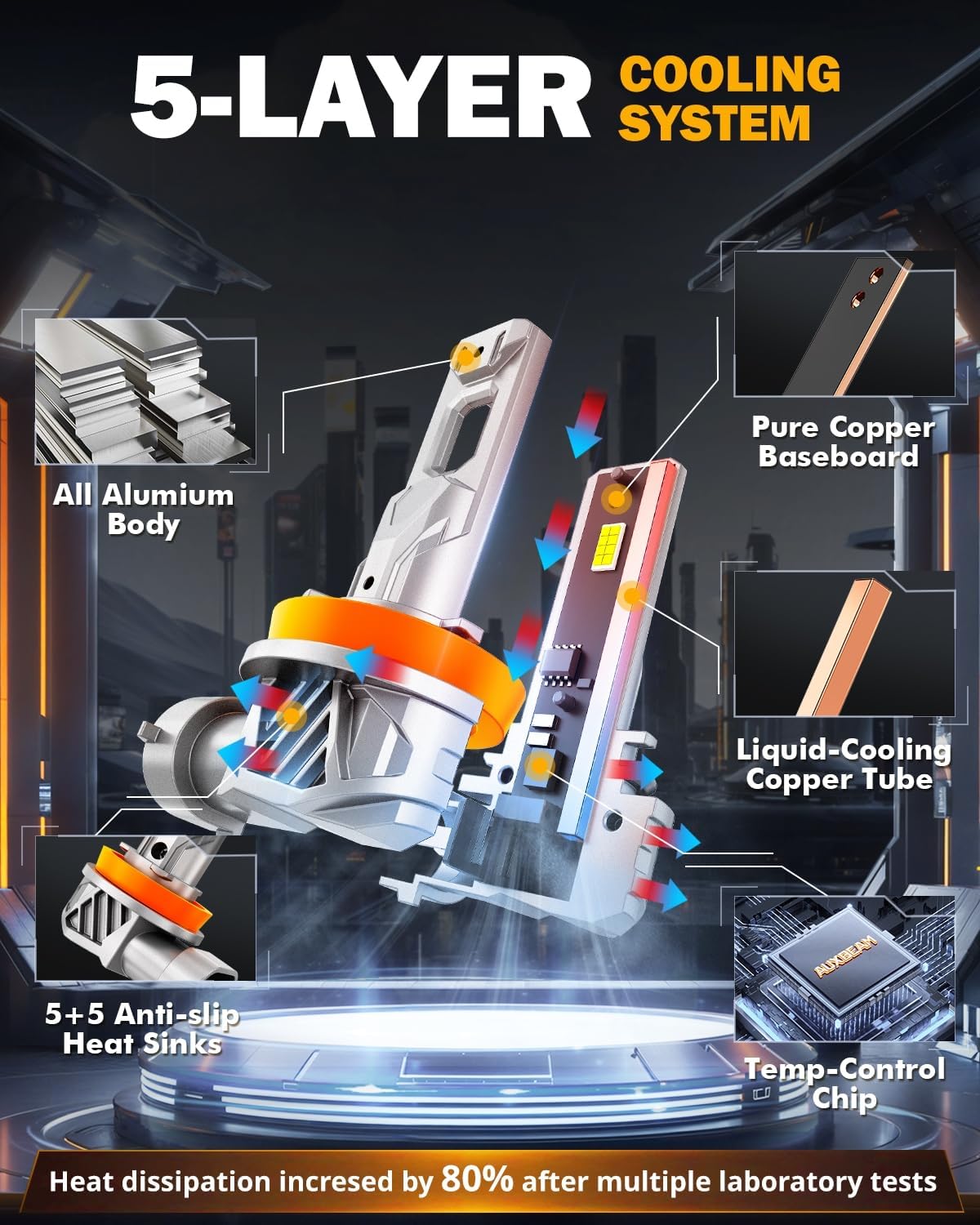 - 5-Layer Cooling System: Auxbeam 9005 H11 lights is designed with built-in liquid-cooling copper tube, customized temp-control chips, pure copper baseboard, 10PCs anti-slip heat sinks and all aluminum shell. Directly improves 80% heat dissipation and extends the service life to 60,000hrs