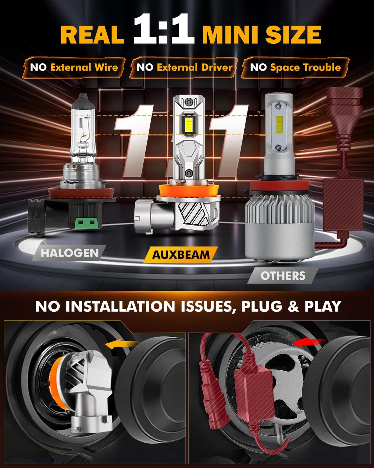 - Plug and Play without Fan: All-in-one metal design, 1:1 mini size, easy installation within 3 minutes. No bulky external driver box, no wiring pigtail, no plastic adapter or plugs.. Perfectly fitting into your housing and factory sockets without modification. The fanless design isolates dust and moisture, avoiding noise, fan issues and wea
