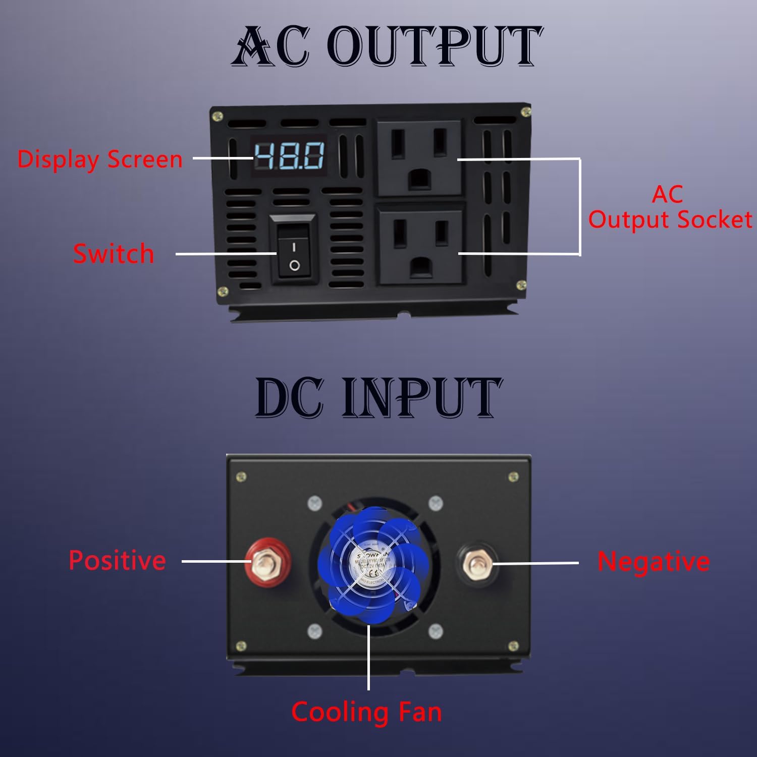 - pure sine wave inverter:Smooth and perfect sine waveform, just the same as home power/city power, Provide max 800 watt continuous power and 1600 watt peak power at 60Hz frequency, power your 110v 120v ac appliance with a 36v power battery bank (battery voltage 30v to 48v is acceptable)