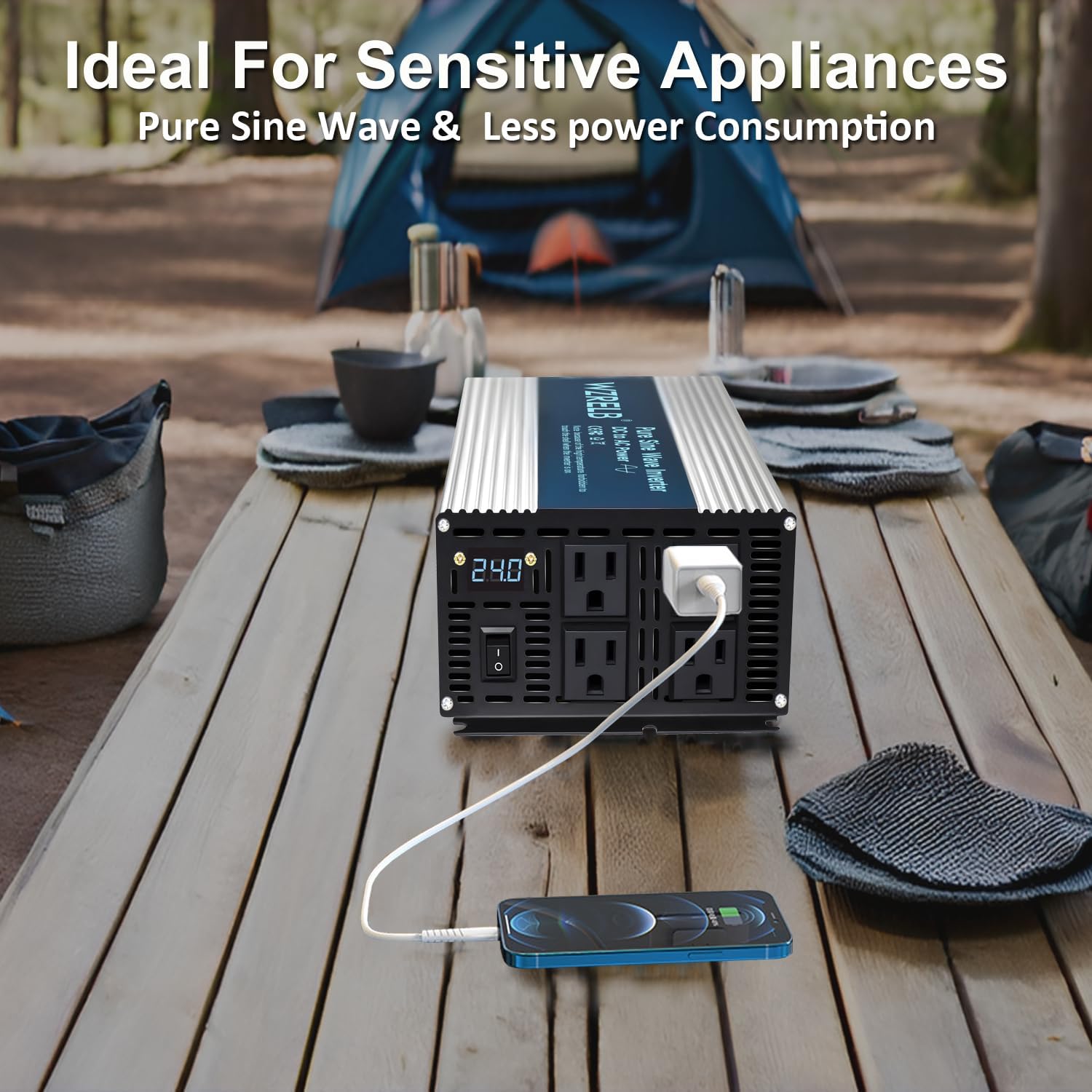 WZRELB 1800W Pure Sine Wave Inverter 24V DC to 110V 120V AC,Car Power Inverter with 4 AC Outlets, LED Display,Off-Grid Portable Power Converter for Home, RV, Truck, Camping