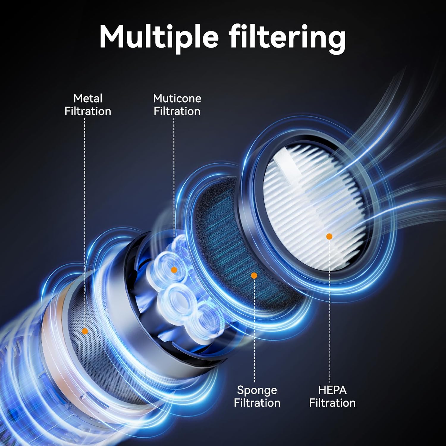 - 【Multi-cone Cyclone Filtration Technologies】The V12 HEPA Vacuum features a upper 6-cone cyclone air duct system and a lower cyclone filtration. Dust and gas will be separated rapidly by the strong centrifugal force generated by the cyclone airflow, and the upgraded HEPA filter can detect very fine particles.