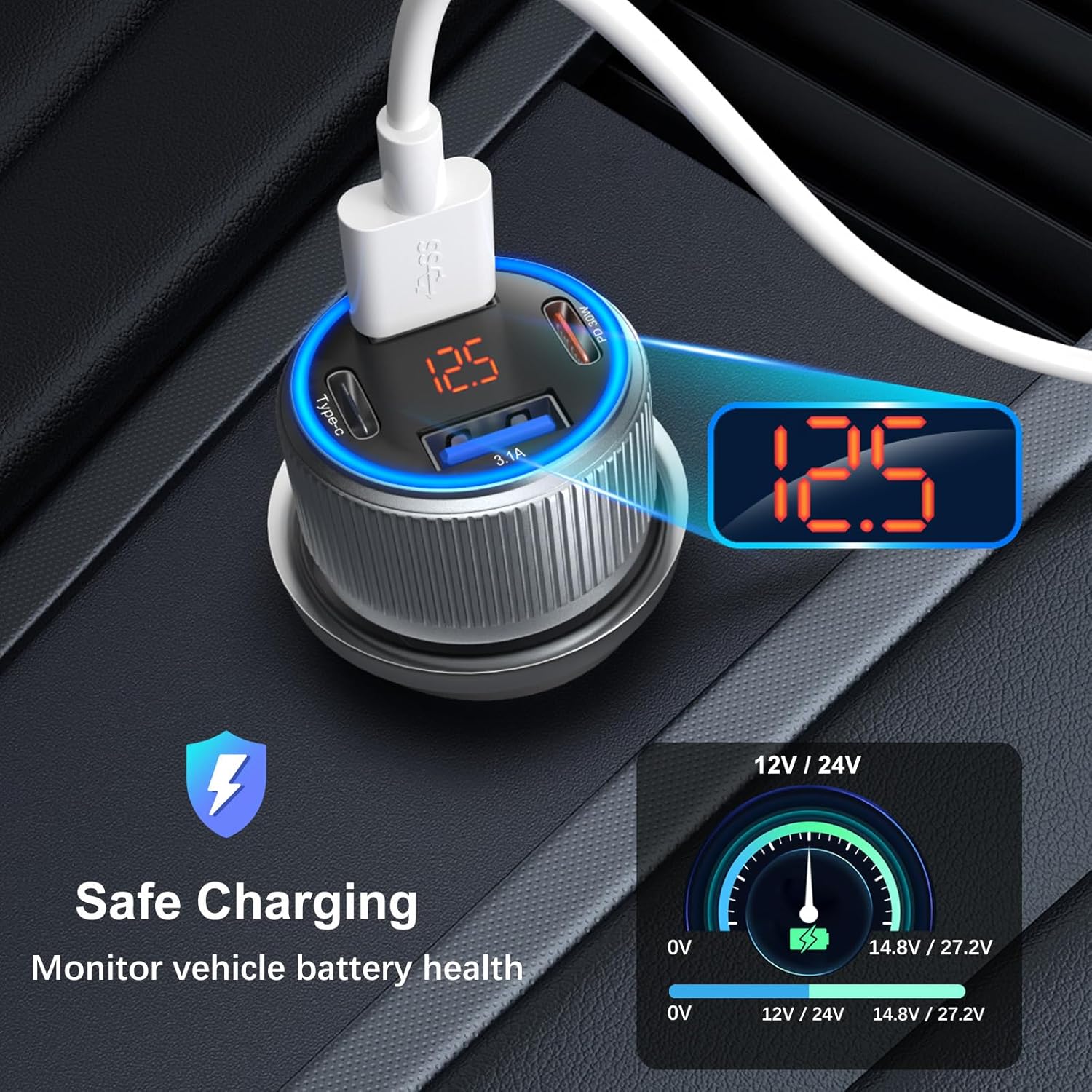 - Special Feature : Car Port Charger with Voltage Reading, Cigarette Lighter Plug with Voltmeter, Power Delivery with PD 3.0 Fast Charging Port, Short Circuit Protection Car Port Charger with Voltage Reading, Cigarette Lighter Plug with Voltmeter, Power Delivery with PD 3.0 Fast Charging Port, Short Circuit Protection