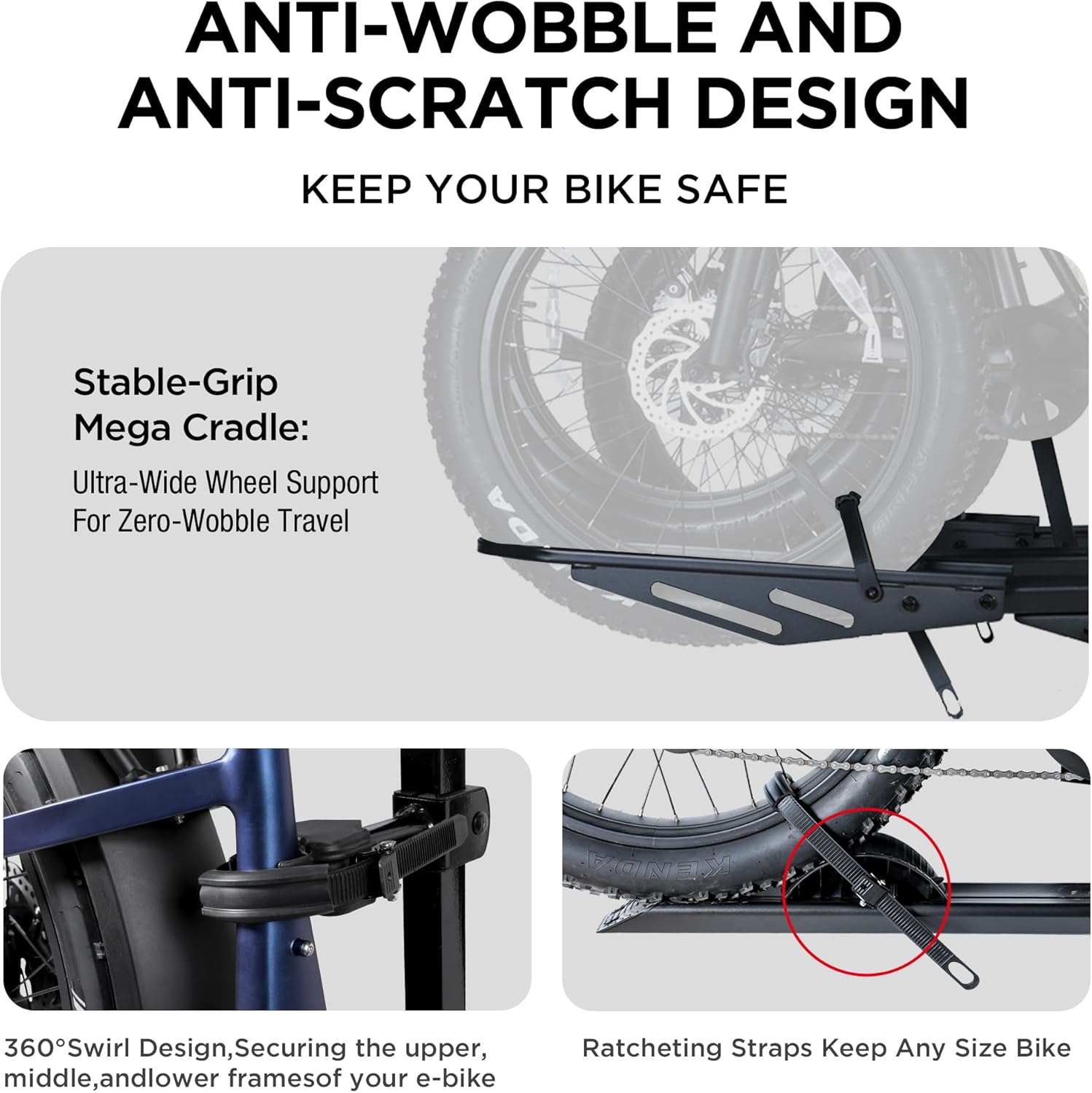 - SAFE AND SECURE ON OFFROAD: Comes with 2-arm fix, patent secure wheel cradles and anti-wobble structure, that secure your E-bikes in place without swaying and knocking against vehicle.