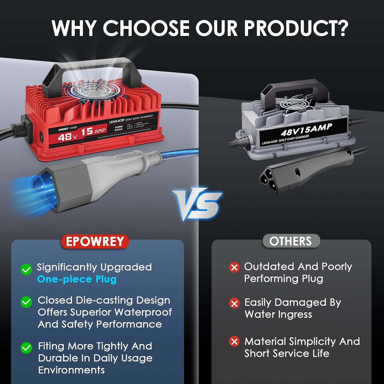 - 【48 Volt 15 Amp Golf Cart Charger】EPOWREY golf cart battery charger is designed to quickly and safely charge EZGO RXV and TXT golf cart batteries with 3-pin Triangular plug. Our golf cart battery charger utilize advanced smart charging technology with high output voltage and current accuracy, good stability and up to 90% efficiency to ensure efficient and reliable power for your golf cart