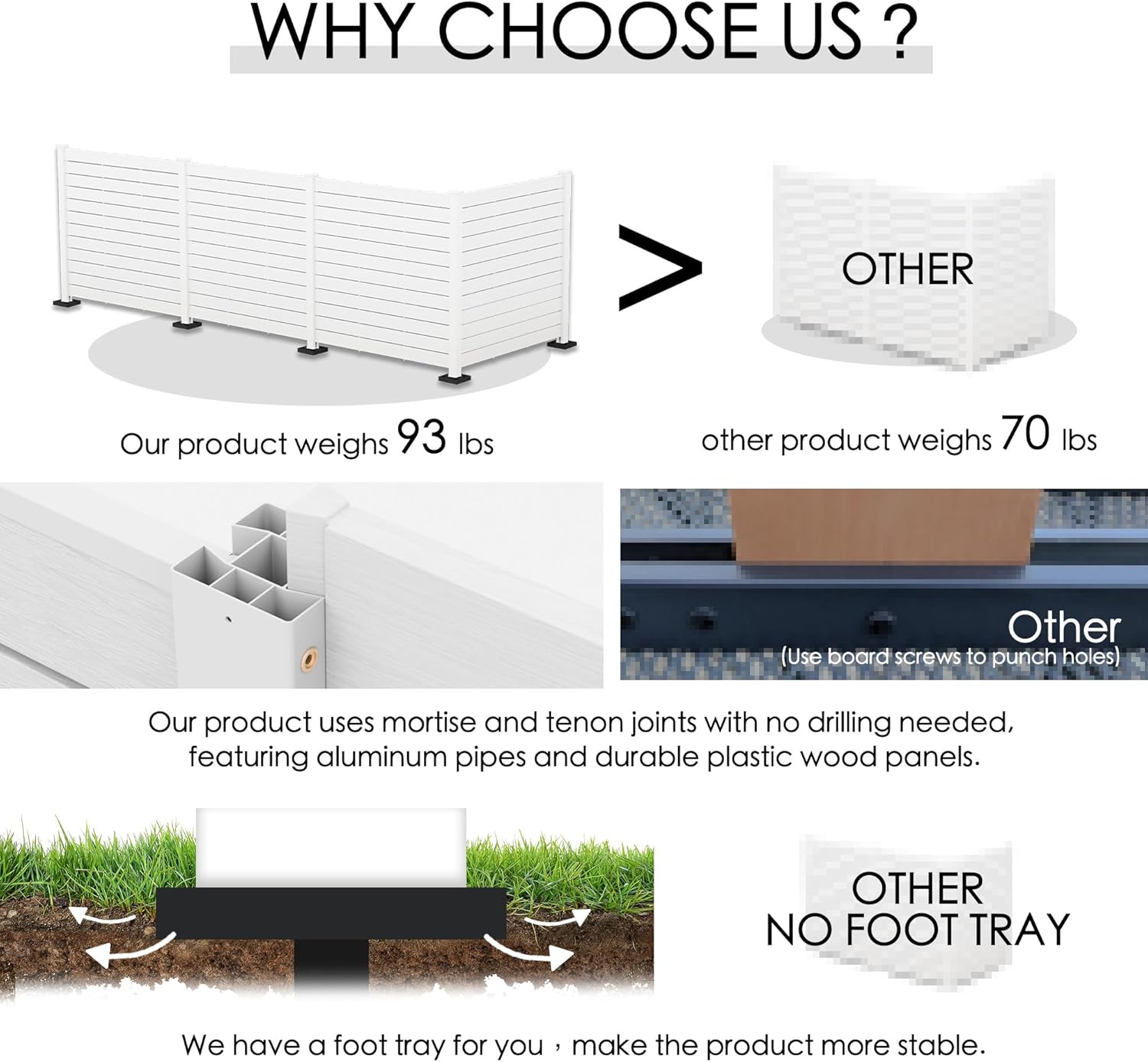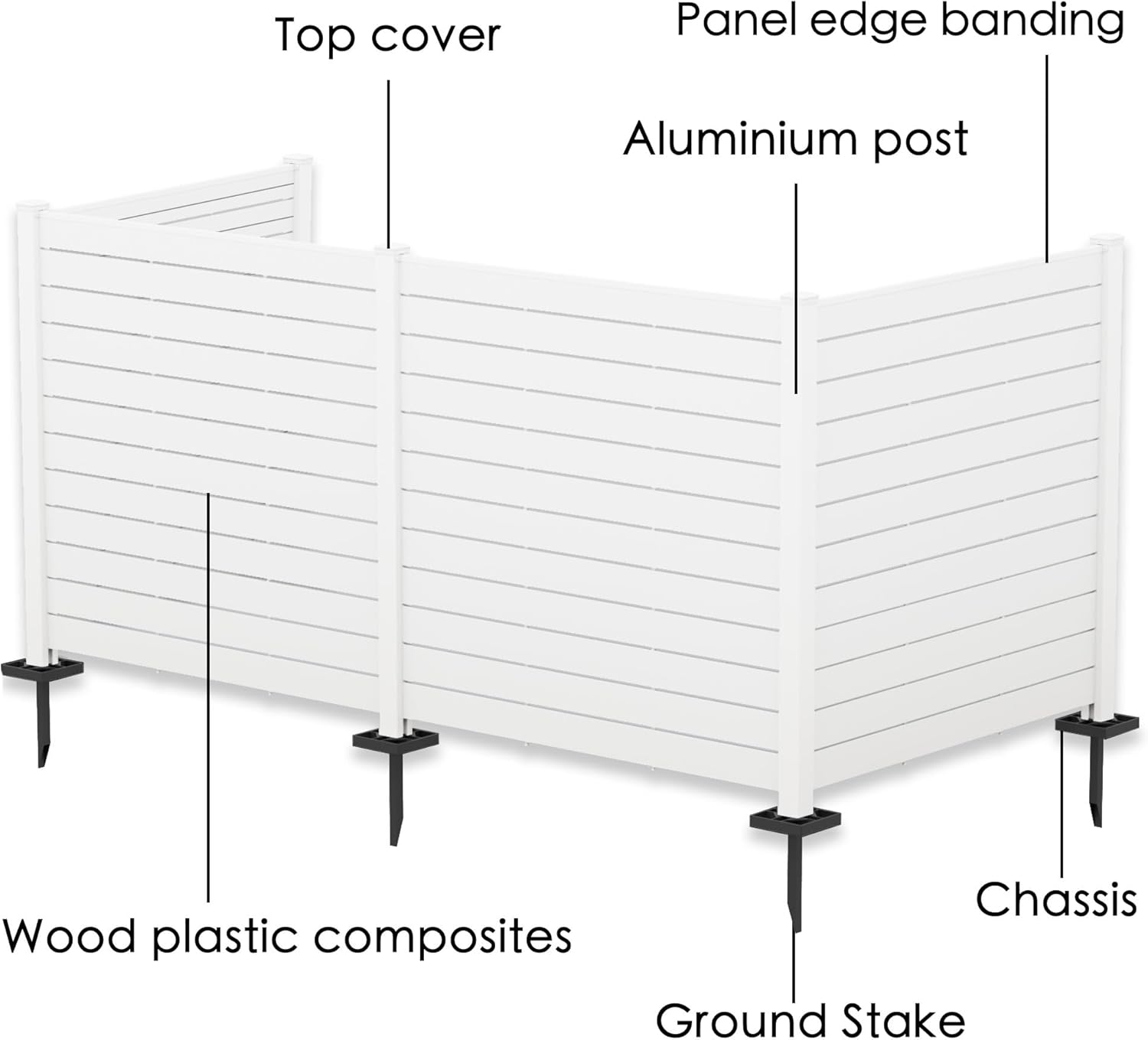 - High-Quality Material: Our outdoor privacy screens are crafted from medium-density polyethylene, designed with a wood-like appearance that is more resistant to water and corrosion than cast iron. The 3/16-inch gaps between the boards provide ventilation while maintaining privacy. The smooth surface resists dust and stains, and the simple white color complements any setting.