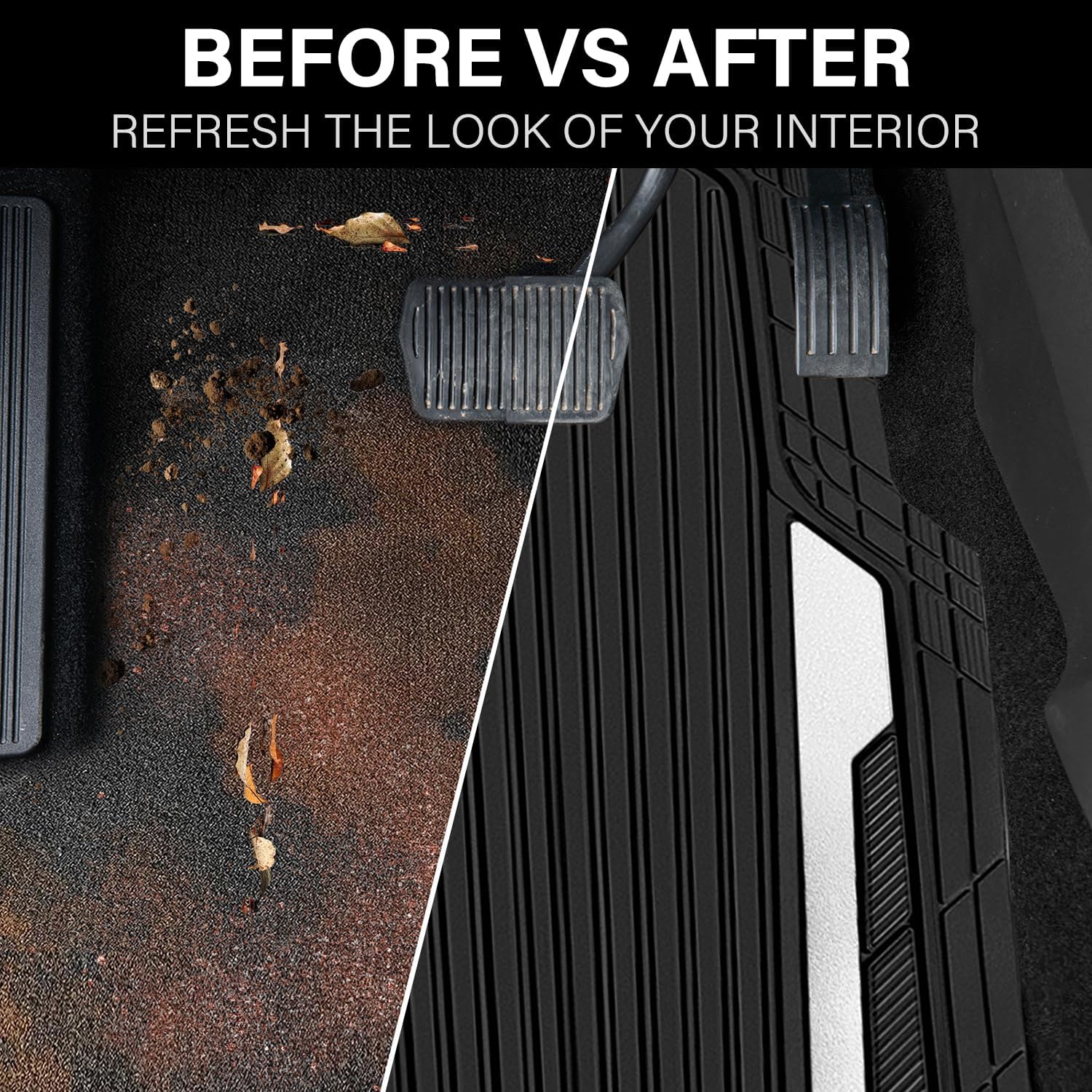 - 【All Weather All Season Protection】Chrome metallic aluminum film heavy duty rubber car mats use for all season.Ridge channels specifically design to prevent fluids from leaking onto carpets,the deep channels also trap any mud, dirt, water or snow that gets in your car