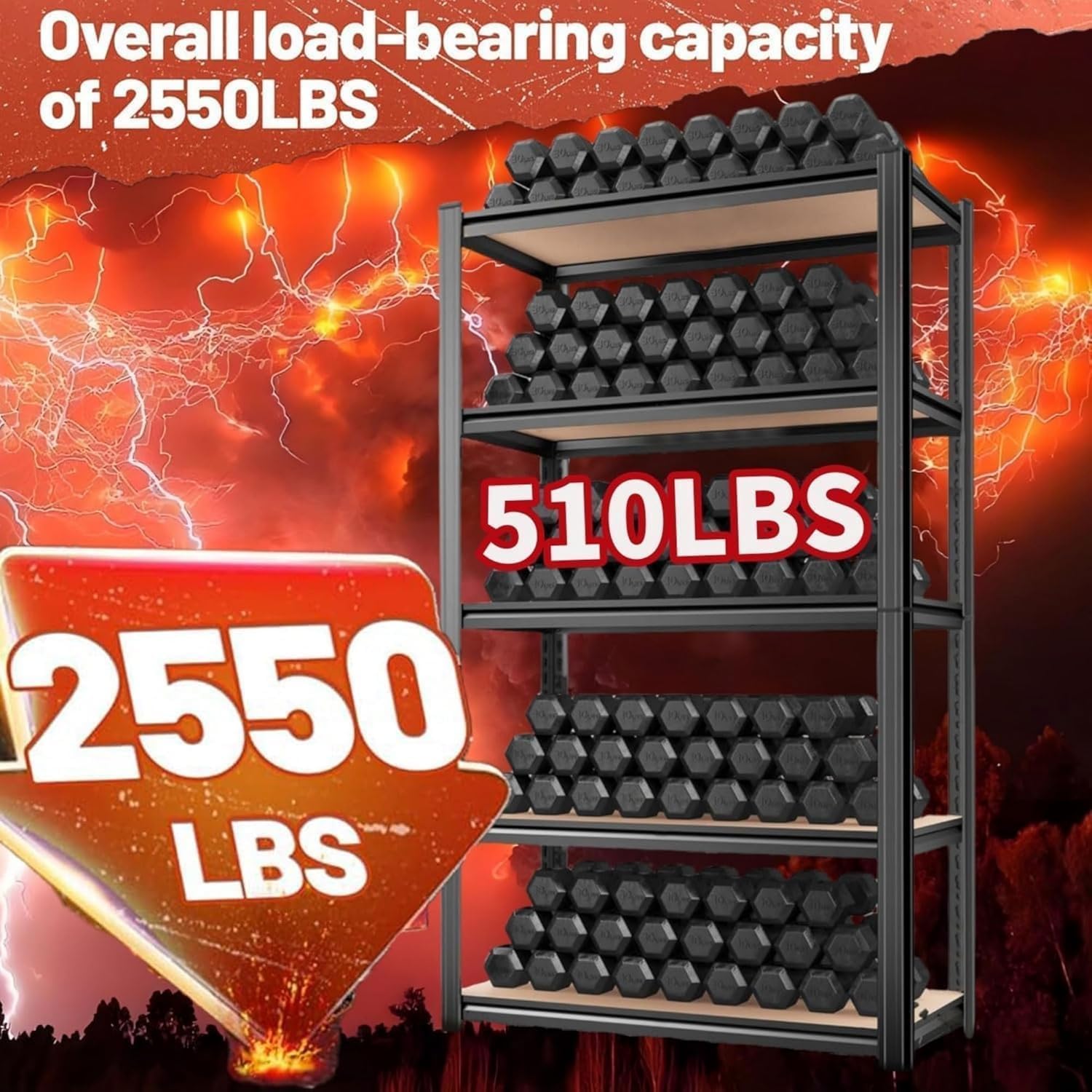 Garage Shelving Unit, 2550Lbs Heavy Duty 5-Tier Metal & Wood Adjustable Storage Rack, Black, 72”H x 35.4”W x 15.8”D, for Garage, Basement, Warehouse, Utility Storage