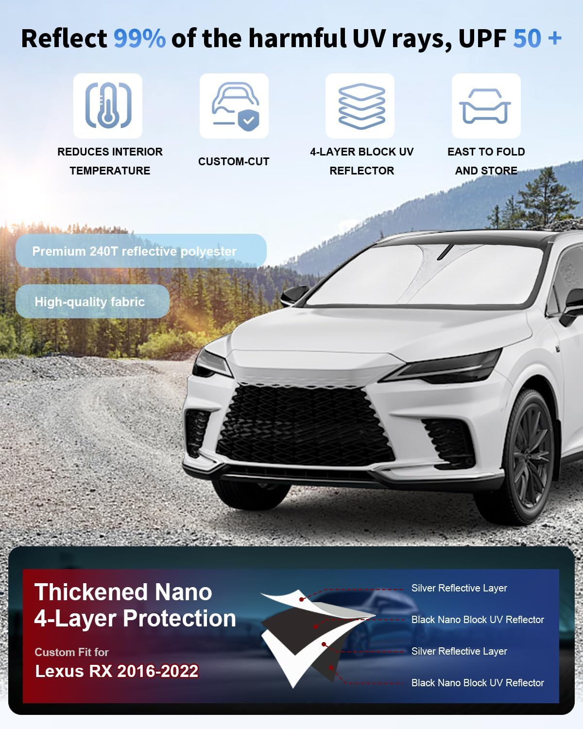 - Vehicle Service Type Custom Fit for Lexus RX 2016-2022 Accessories : Material Insulation layer and silver 240T reflective polyester fibre Insulation layer and silver 240T reflective polyester fibre See more