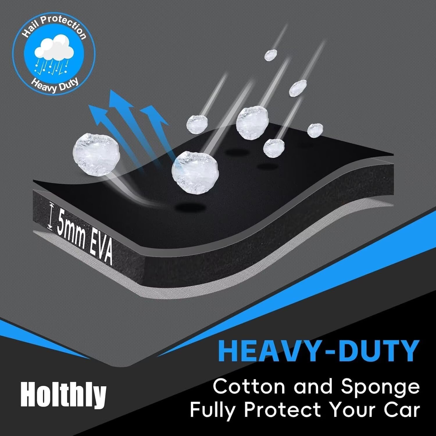 - 【Excellent Protection】- The roof and window positions of the Holthly hail protection car cover are made of 2025 new EVA material. Compared with the 190T cotton-containing material, it has better cushioning performance, can effectively absorb the impact of hail, resistant to cherry-sized hail, providing all-round protection for the vehicle and reducing the risk of vehicle damage.