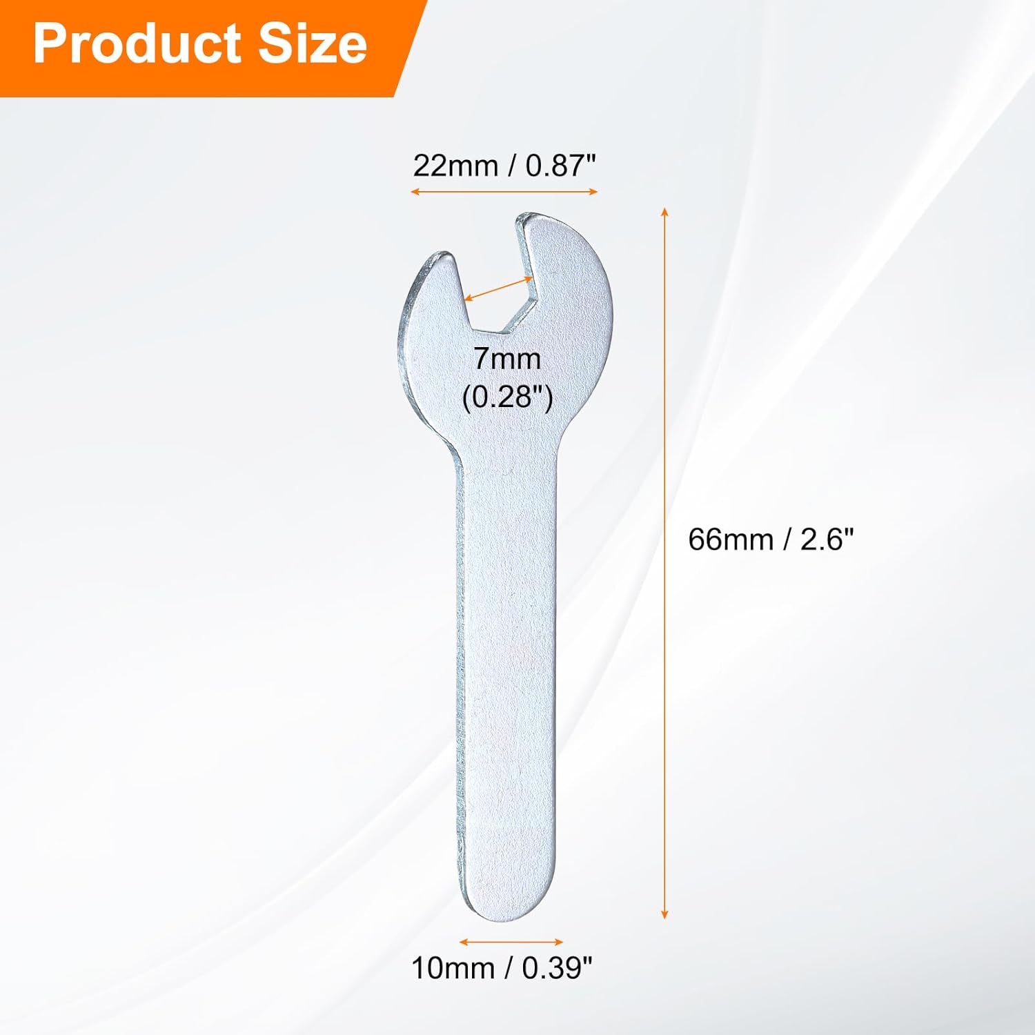 - Size - Open end: 7mm / 0.28"; Open outside width: 22mm / 0.87"; Total length: 66mm / 2.6"; Stem thickness: 1.5mm / 0.06"; Stem width: 10mm / 0.39"; Color: Silver-grey; Package includes: 10 x Single open-end wrenches. The open wrench set is thin enough to work on tight spots.