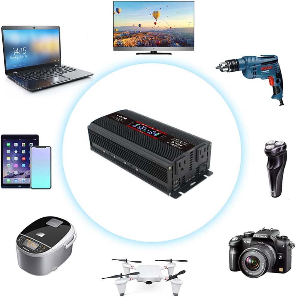 - POWERFUL OUTPUT: Convert power of DC 12V to AC 110V/120V 60Hz. Provides 1500 Watts continuous modified sine wave power and 3000 Watts surge power. Featuring 2 AC outlets and 2 USB ports for multi-purpose charging. Great High efficiency: conversion efficiency > 90%. The rated output power of this device is 1500W, it could definitely be realized in reality.