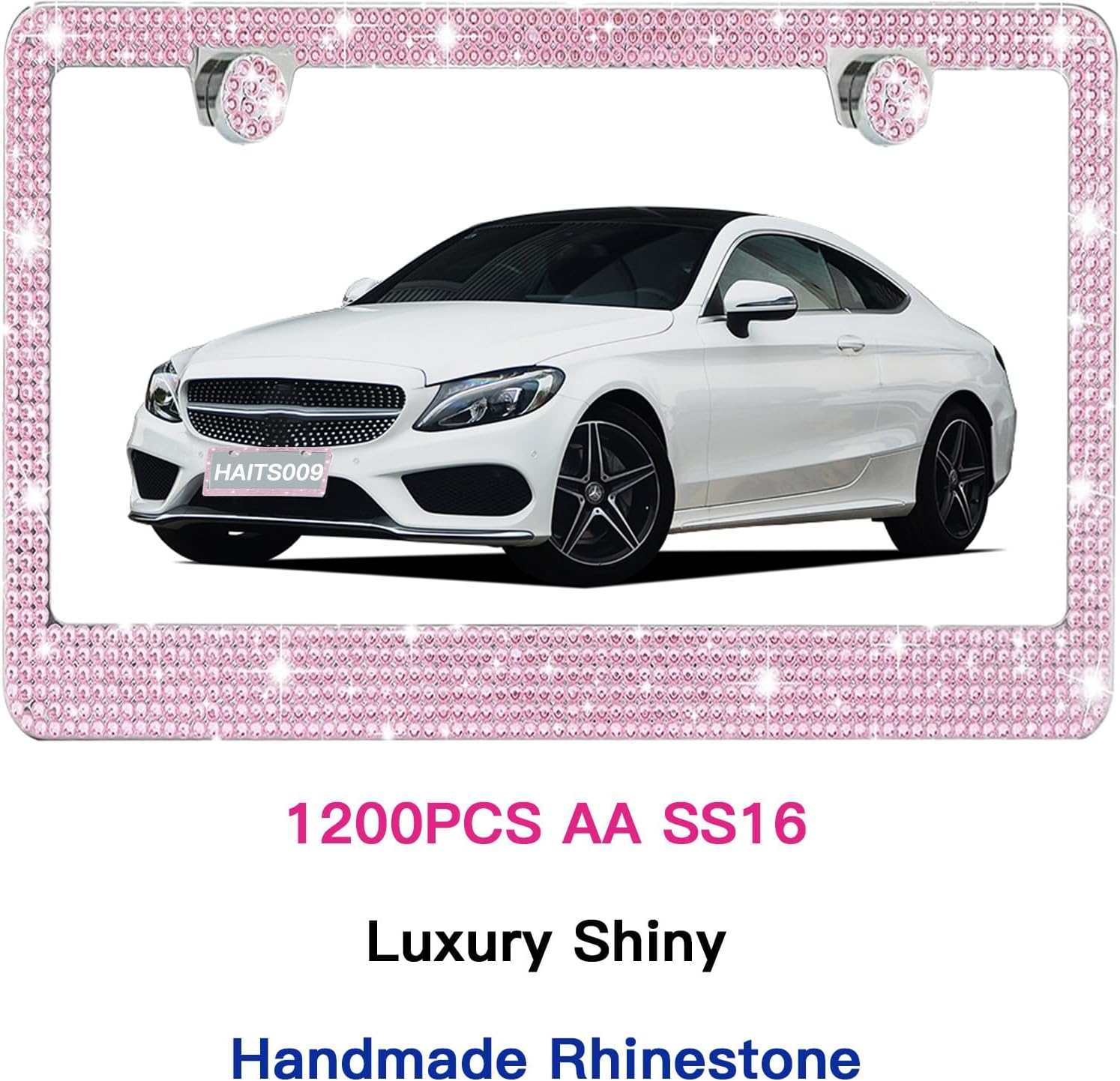 2 Pack License Plate Frames for Women, Sparkly Rhinestone Diamond Car Accessories with Glitter Crystal Caps (Pink (2PCS))