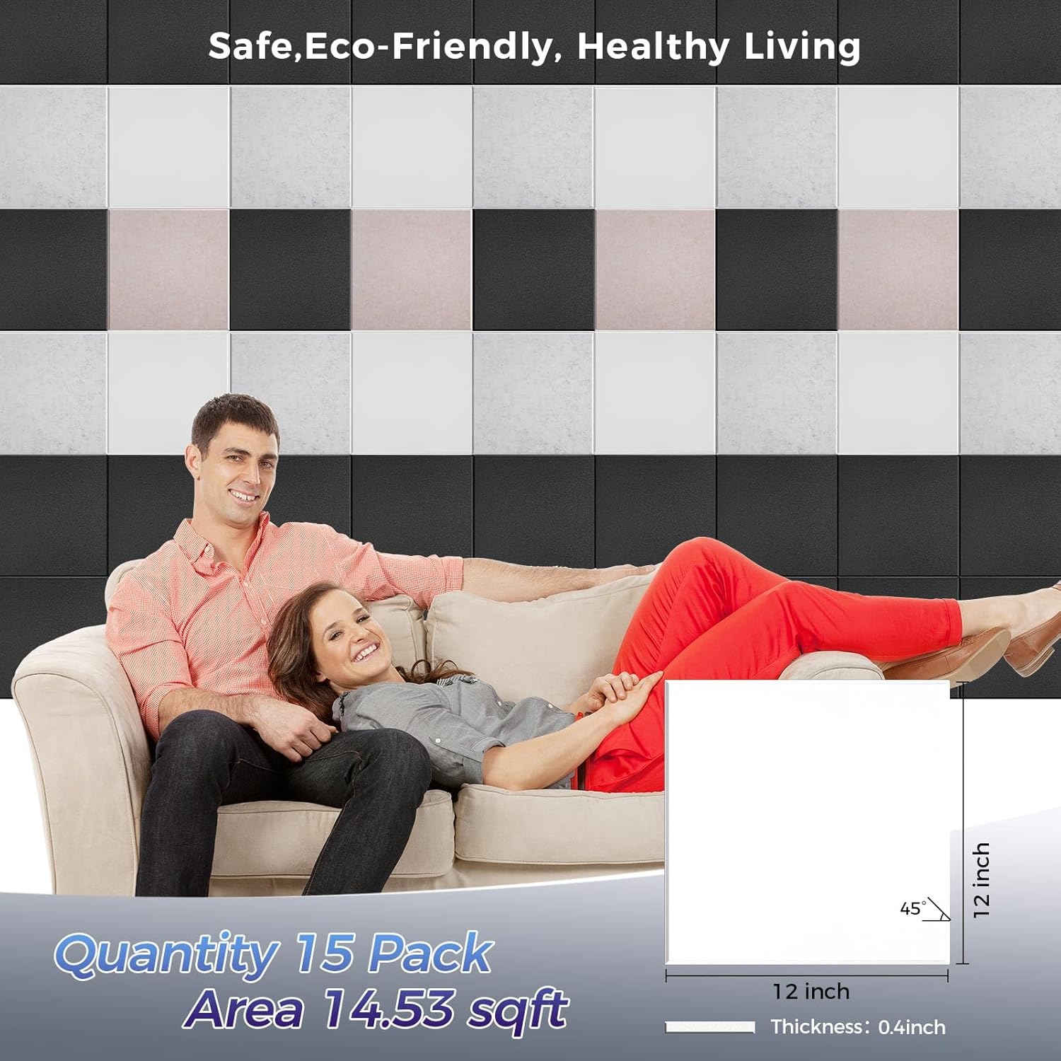 15 pcs 165dtex Microfiber Acoustic Panels ,Self-Adhesive Soundproof Wall Panels, 12 x 12 x 0.4 in Sound Proof Foam Panels for Walls, High Density, Noise Dampening Panels for Home Studio(White)
