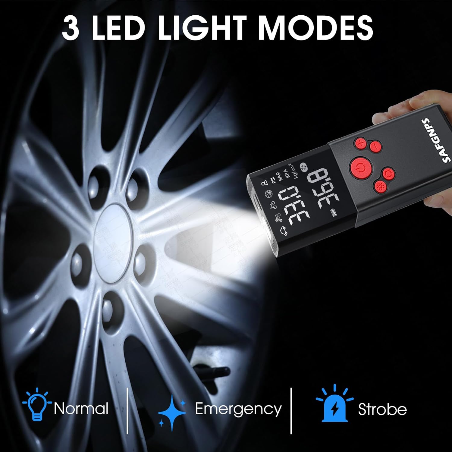 - 【All-in-One Device】Not just an inflator air pump: Portable tire pump for car features 3 LED emergency modes (SOS, Steady, Strobe) for nighttime/emergency use Battery air pump includes Power Bank function to charge your devices in emergencies