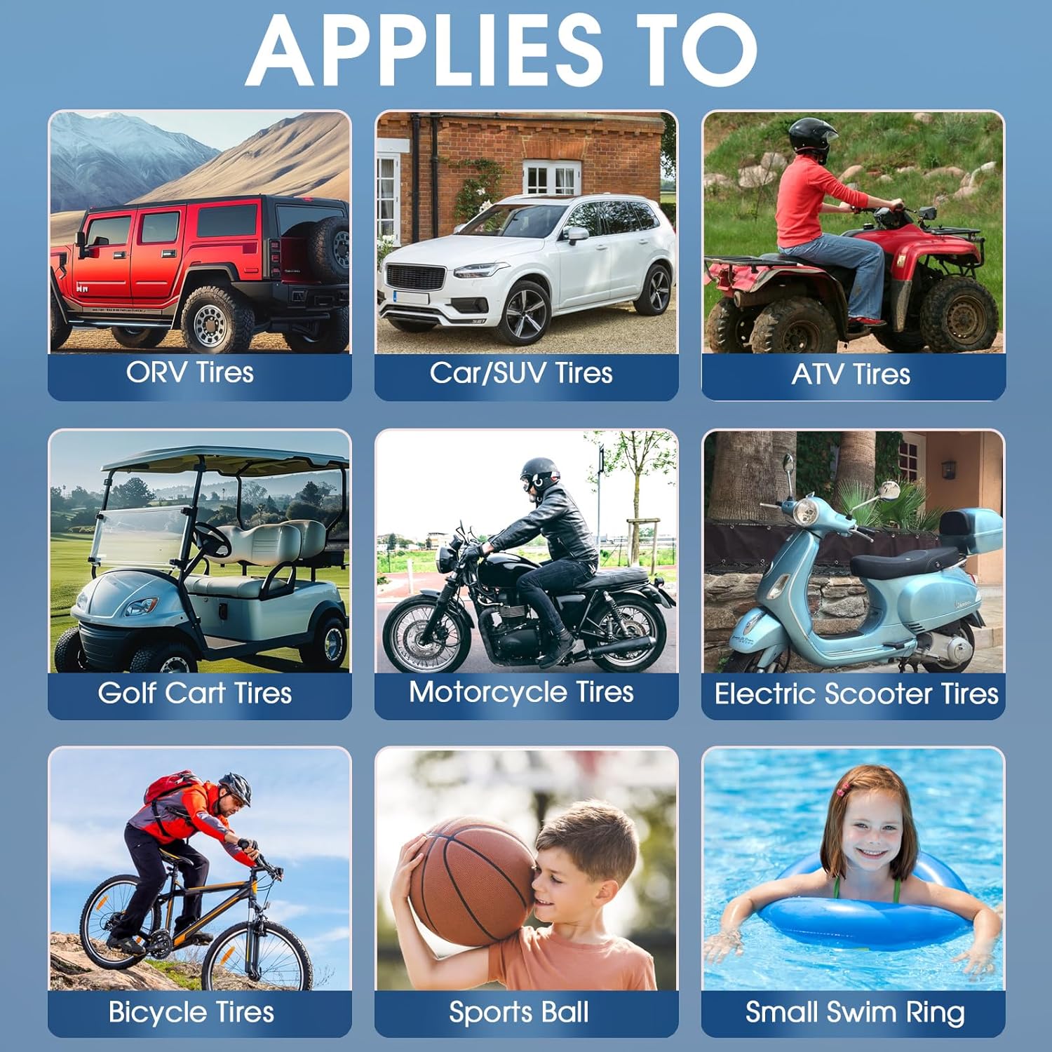 - 【5 Smart Modes + Auto Shut-Off】The portable inflator pump offers 4 preset inflation modes (Car/Motorcycle/Bicycle/Ball), and a 5th user-friendly custom mode, set target pressure (0-150PSI adjustable) based on your inflation needs, the car tire air pump portable automatically stops when reaching target pressure, eliminating overinflation risks, perfect for diverse inflation needs