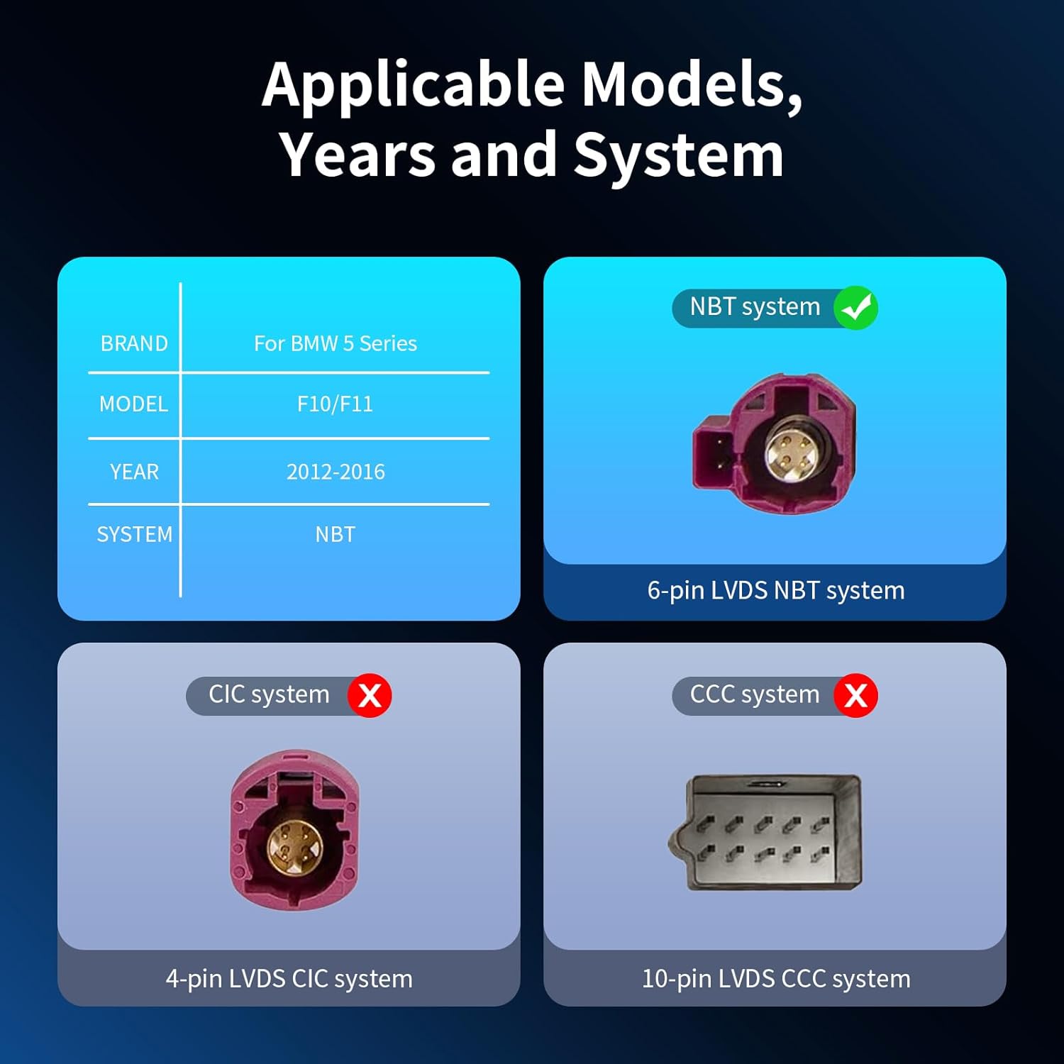 - 【Pre-purchase Notice】This touch screen is a Linux car display upgrade accessory for BMW models. Applicable to BMW 5 Series (2012-2016), chassis code F10/F11, models equipped with NBT system with 6-pin LVDS cable (not compatible with NBT evo). If you are not sure about your vehicle system, please consult us. If you are not sure how to install it, you can watch the instructions and installation video we provide.