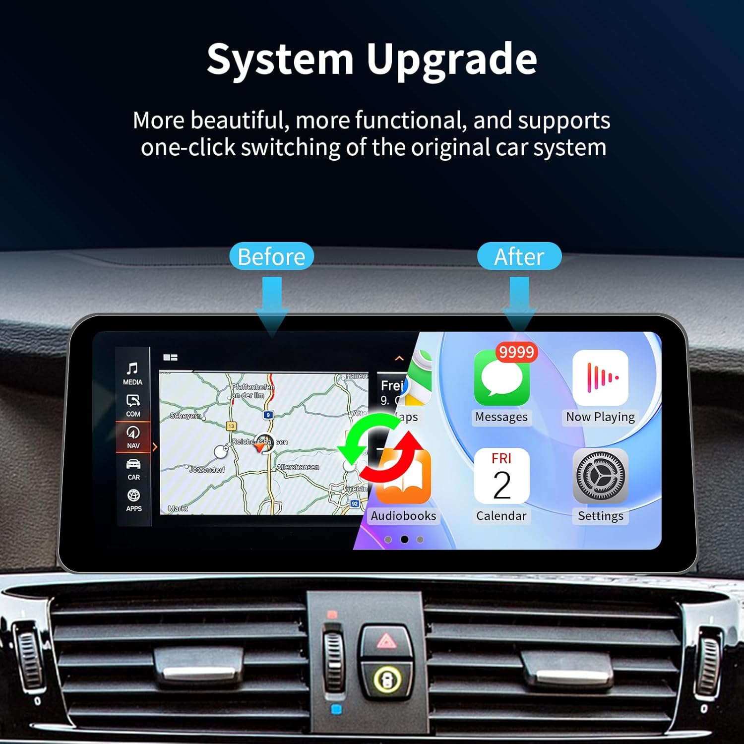 - 【System Upgrade and One-click Switch】After the upgrade, the touchscreen adopts dual system operation, retaining the original car functions while adding Linux system functions. Functions such as FM radio, multimedia, steering wheel control, i-drive knob control, OEM reversing camera, etc. are still intact, and there is no need to make any software changes to the vehicle's control unit. The upgraded system and the original OEM system can be switched with one click to meet different driving needs.