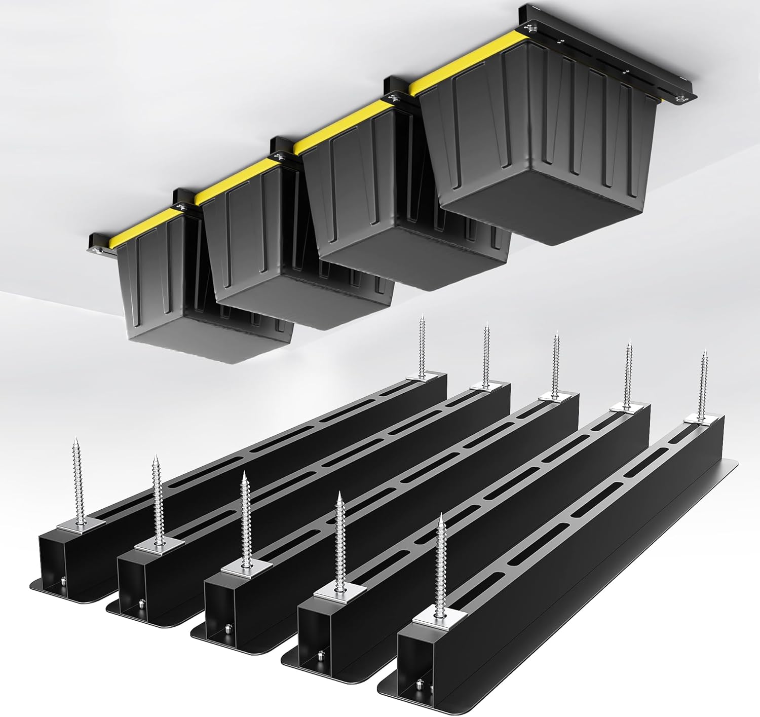 - Quality Guarantee: This ceiling storage system includes 5 brackets (storage boxes not included). All parts undergo strict quality and safety testing to ensure reliability. If you encounter any issues, feel free to contact us