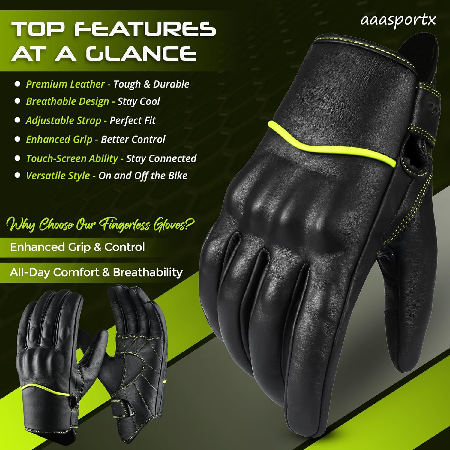 - LEATHER MOTORCYCLE GLOVES - aaasportx black and yellow Motorcycle Gloves are made of premium quality Genuine Leather. Our Lightweight Motorcycle Gloves ensures durability through a variety of situations. aaasportx Motorcycle Gloves for Men offer a high-quality, stylish, and durable finish that excludes sophistication and toughness on the road.
