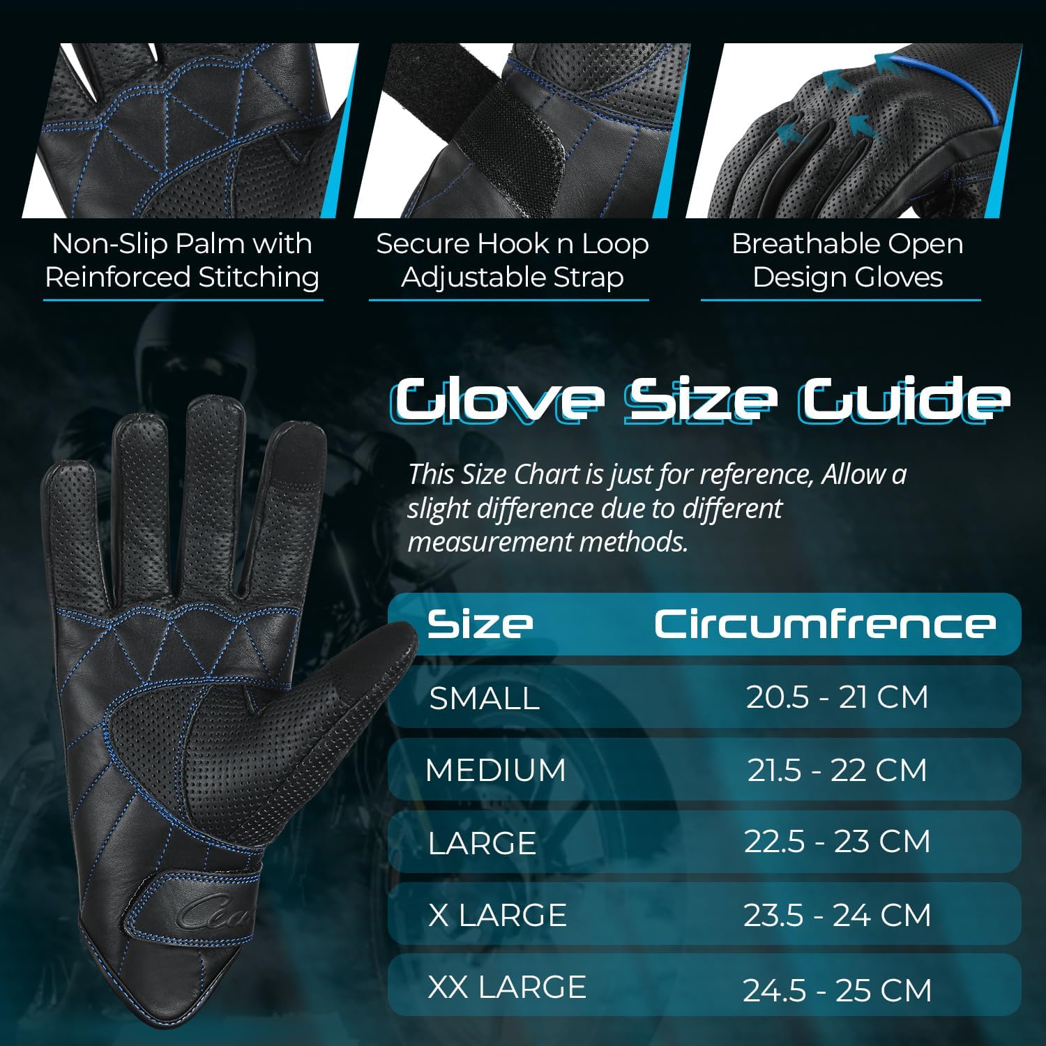 - LEATHER MOTORCYCLE GLOVES - aaasportx breathable black blue Motorcycle Gloves are made of Genuine perforated Leather. Our Lightweight Motorcycle Gloves ensures durability through a variety of situations. aaasportx Motorcycle Gloves for Men offer a high-quality, stylish, and durable finish that excludes sophistication and toughness on the road.