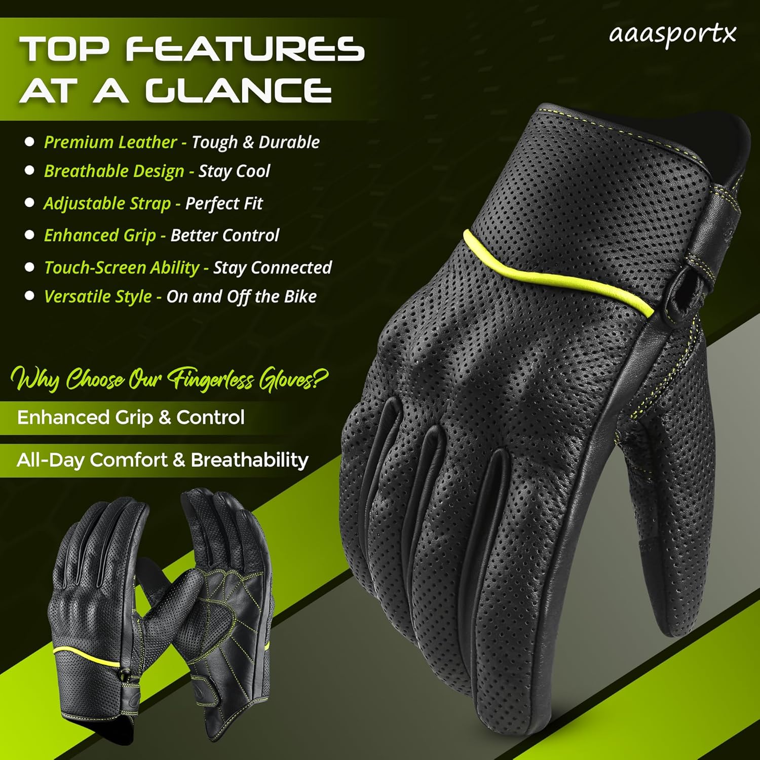 - LEATHER MOTORCYCLE GLOVES - aaasportx perforated leather black and yellow Motorcycle Gloves are made of premium quality Genuine Leather. Our Lightweight Motorcycle Gloves ensures durability through a variety of situations. aaasportx Motorcycle Gloves for Men offer a high-quality, stylish, and durable finish that excludes sophistication and toughness on the road.