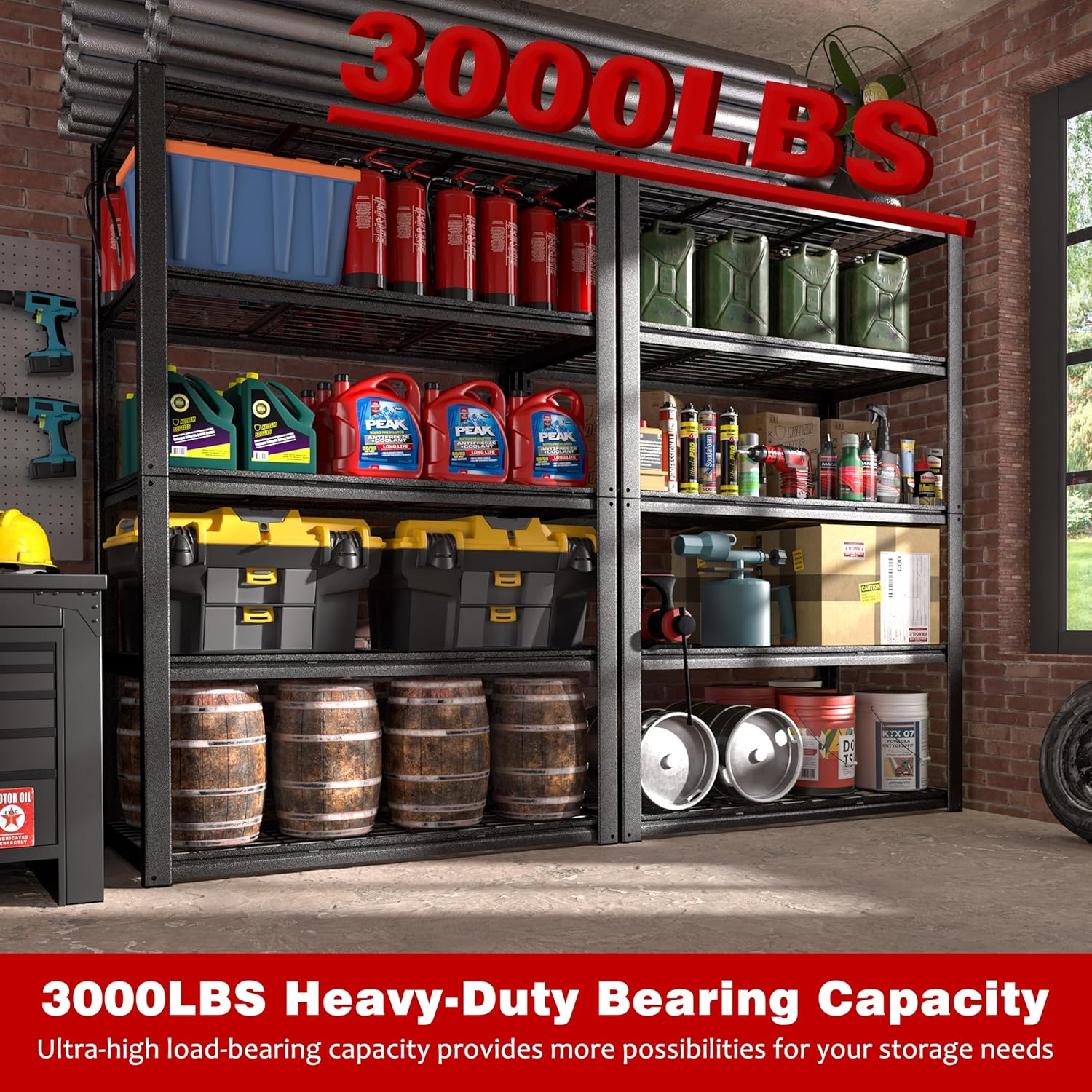 - Sturdy and Heavy Duty: 1 pack Garage shelving assembled dimension: 48.43" W x 23.98" D x 72.05" H, Max Load Per Shelf:600lbs, 5 tier shelves' total max load weight is 3000 lbs. Sturdy metal frame enhanced load-bearing capacity. No wobbling or shaking when fully loaded as this metal shelving has extra support beams which can enhance the stability and durability of the storage shelves.
